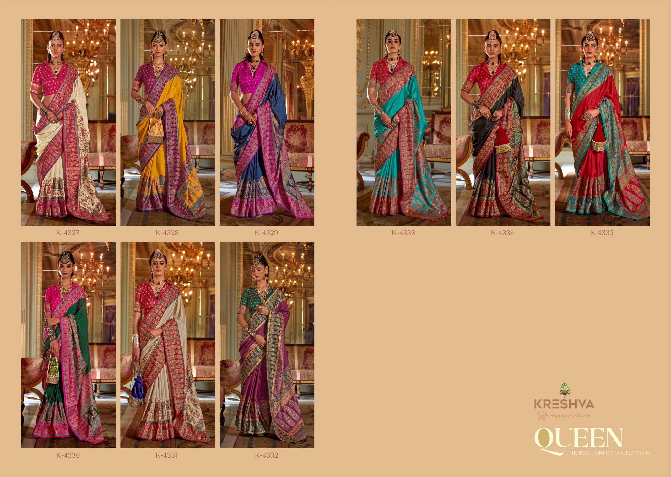 Buy Online Kreshva Queen Hight Quality Silk With Weaving Border Function Special Saree Best Collection 9 Pcs of Full Catalogue at Wholesale Price. Looking for Kreshva Queen Hight Quality Silk With Weaving Border Function Special Saree Best Collection Full Catalouge at Best Price? Buy Now Kreshva Queen Hight Quality Silk With Weaving Border Function Special Saree Best Collection at Wholesale Rate of Rs 11655 with Total 9 Pcs from authroized dealer and supplier of KRESHVA Online Saree Brand. Cost of Each piece is just only Rs 1295 which is very low and affordable price to resale the product in your retail store Ethnic Export is Surat based Wholesale Supplier & Dealer of KRESHVA Online Saree Brand. Click on Brand name to Know more about KRESHVA Online Saree Brand's products.Call or Whatsapp on +91-9825759366 for booking or enquiry
