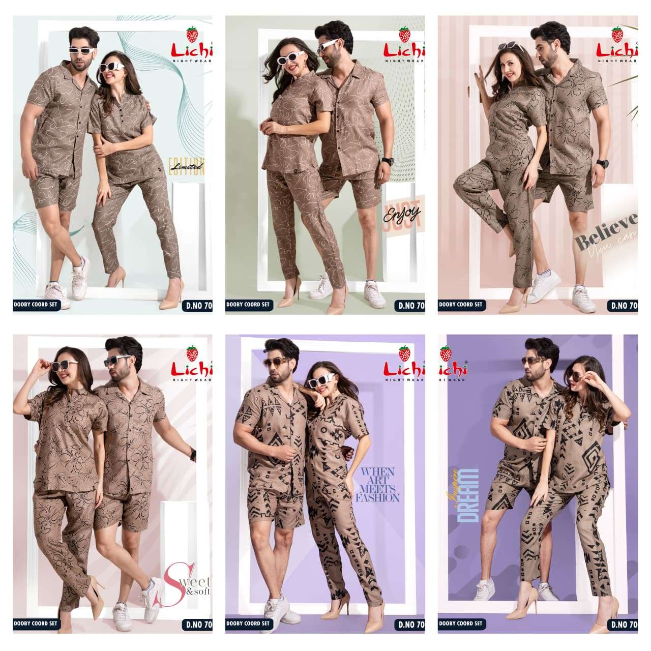 Buy Online LICHI NIGHT WEAR 7004 RAYON DOBBY COUPLE CORD SET TO TRAVELING CLOTH MARKET 6 Pcs of Full Catalogue at Wholesale Price. Looking for LICHI NIGHT WEAR 7004 RAYON DOBBY COUPLE CORD SET TO TRAVELING CLOTH MARKET Full Catalouge at Best Price? Buy Now LICHI NIGHT WEAR 7004 RAYON DOBBY COUPLE CORD SET TO TRAVELING CLOTH MARKET at Wholesale Rate of Rs 7050 with Total 6 Pcs from authroized dealer and supplier of LICHI NIGHT WEAR Brand. Cost of Each piece is just only Rs 1175 which is very low and affordable price to resale the product in your retail store Ethnic Export is Surat based Wholesale Supplier & Dealer of LICHI NIGHT WEAR Brand. Click on Brand name to Know more about LICHI NIGHT WEAR Brand's products.Call or Whatsapp on +91-9825759366 for booking or enquiry