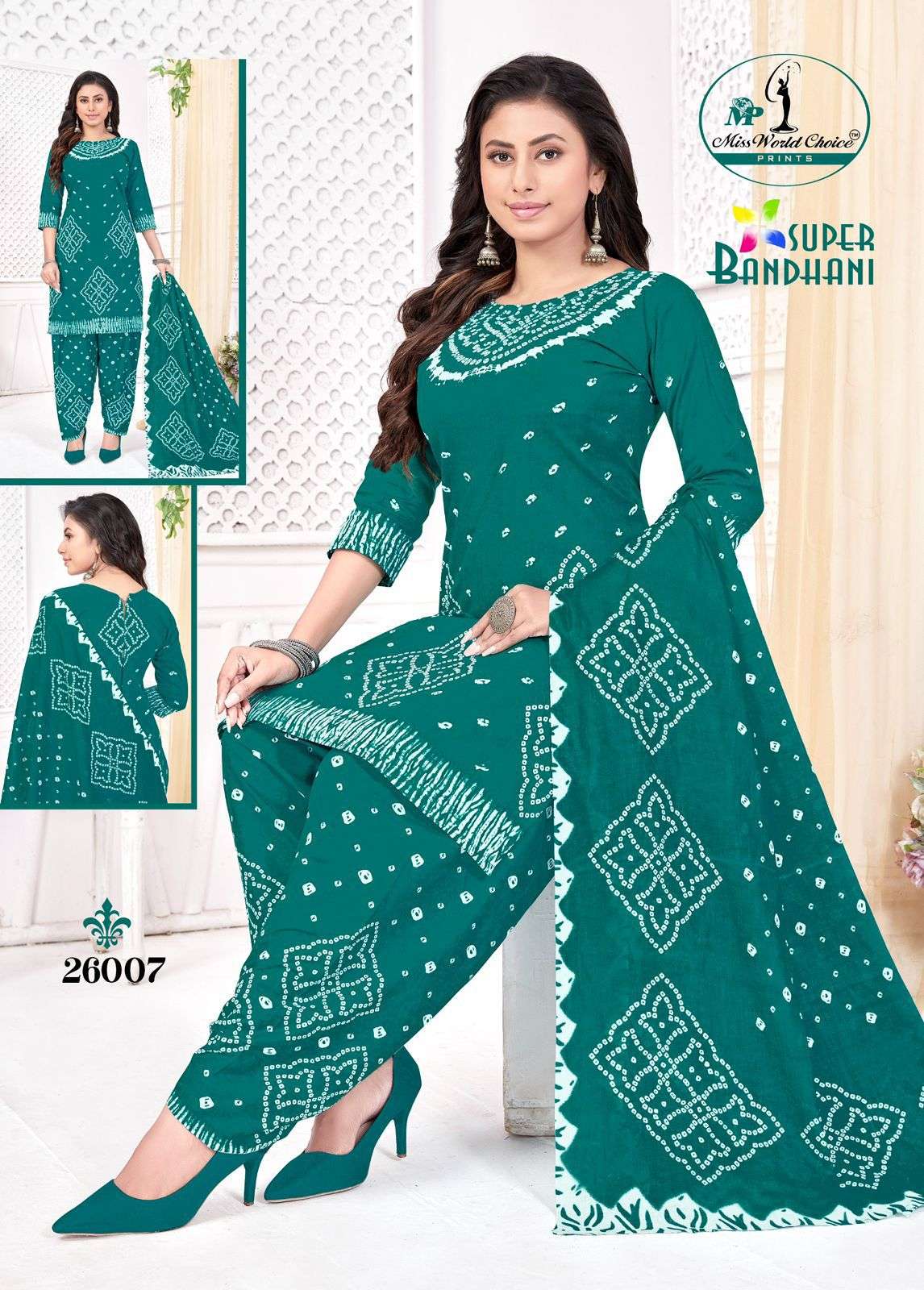 Buy Online MISS WORLD SUPER BANDHNI VOL 26 SUMMER SEASON HEAVY COTTON SALWAR KAMEEZ COLLECTION LOW PRICE 10 Pcs of Full Catalogue at Wholesale Price. Looking for MISS WORLD SUPER BANDHNI VOL 26 SUMMER SEASON HEAVY COTTON SALWAR KAMEEZ COLLECTION LOW PRICE Full Catalouge at Best Price? Buy Now MISS WORLD SUPER BANDHNI VOL 26 SUMMER SEASON HEAVY COTTON SALWAR KAMEEZ COLLECTION LOW PRICE at Wholesale Rate of Rs 3400 with Total 10 Pcs from authroized dealer and supplier of MISS WORLD Brand. Cost of Each piece is just only Rs 340 which is very low and affordable price to resale the product in your retail store Ethnic Export is Surat based Wholesale Supplier & Dealer of MISS WORLD Brand. Click on Brand name to Know more about MISS WORLD Brand's products.Call or Whatsapp on +91-9825759366 for booking or enquiry