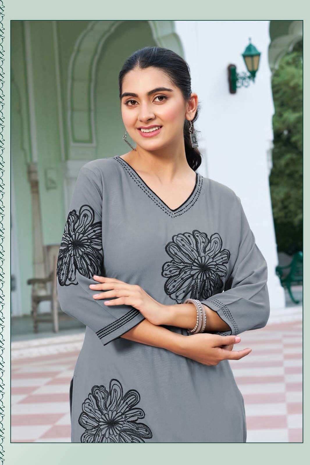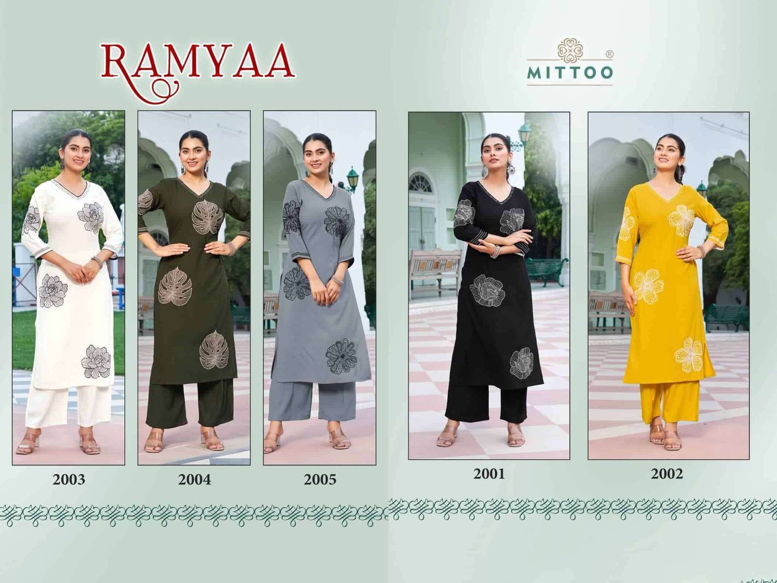 Buy Online MITTOO RAMYAA HEAVY RAYON THREAD WORK KURTI PALAZZO SET TOP MARKET 5 Pcs of Full Catalogue at Wholesale Price. Looking for MITTOO RAMYAA HEAVY RAYON THREAD WORK KURTI PALAZZO SET TOP MARKET Full Catalouge at Best Price? Buy Now MITTOO RAMYAA HEAVY RAYON THREAD WORK KURTI PALAZZO SET TOP MARKET at Wholesale Rate of Rs 3975 with Total 5 Pcs from authroized dealer and supplier of Mittoo Kurtis Brand. Cost of Each piece is just only Rs 795 which is very low and affordable price to resale the product in your retail store Ethnic Export is Surat based Wholesale Supplier & Dealer of Mittoo Kurtis Brand. Click on Brand name to Know more about Mittoo Kurtis Brand's products.Call or Whatsapp on +91-9825759366 for booking or enquiry