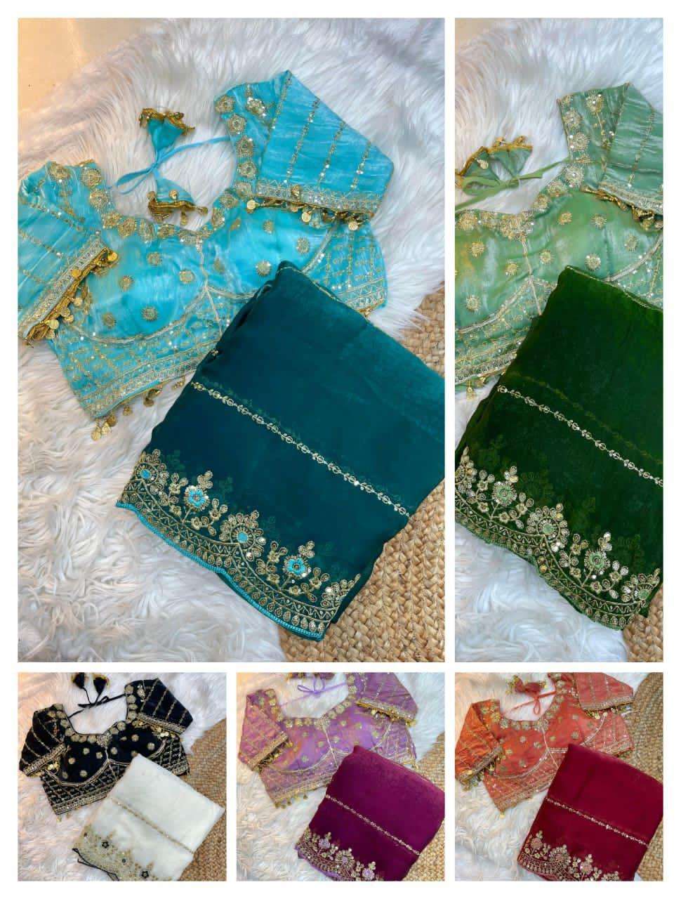 Saree:- Very soft & elegant rich look fendy sartin fabric with beautiful embroidery 3 mm sequence work heavy border with buttis in all over saree aarco Blouse:- Paired with fully Stiched heavy jhal work embroidery sequence design with nd fancy tussels Design 5 Single Also Avaible |