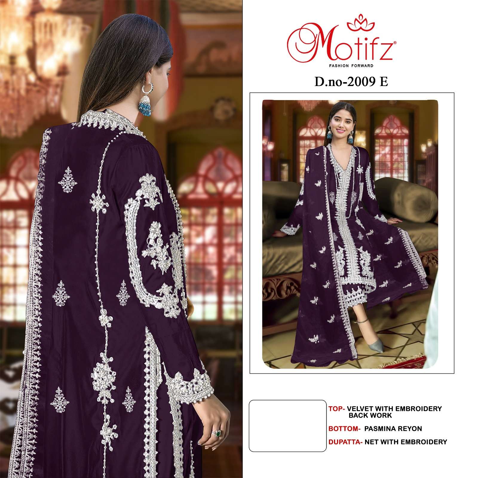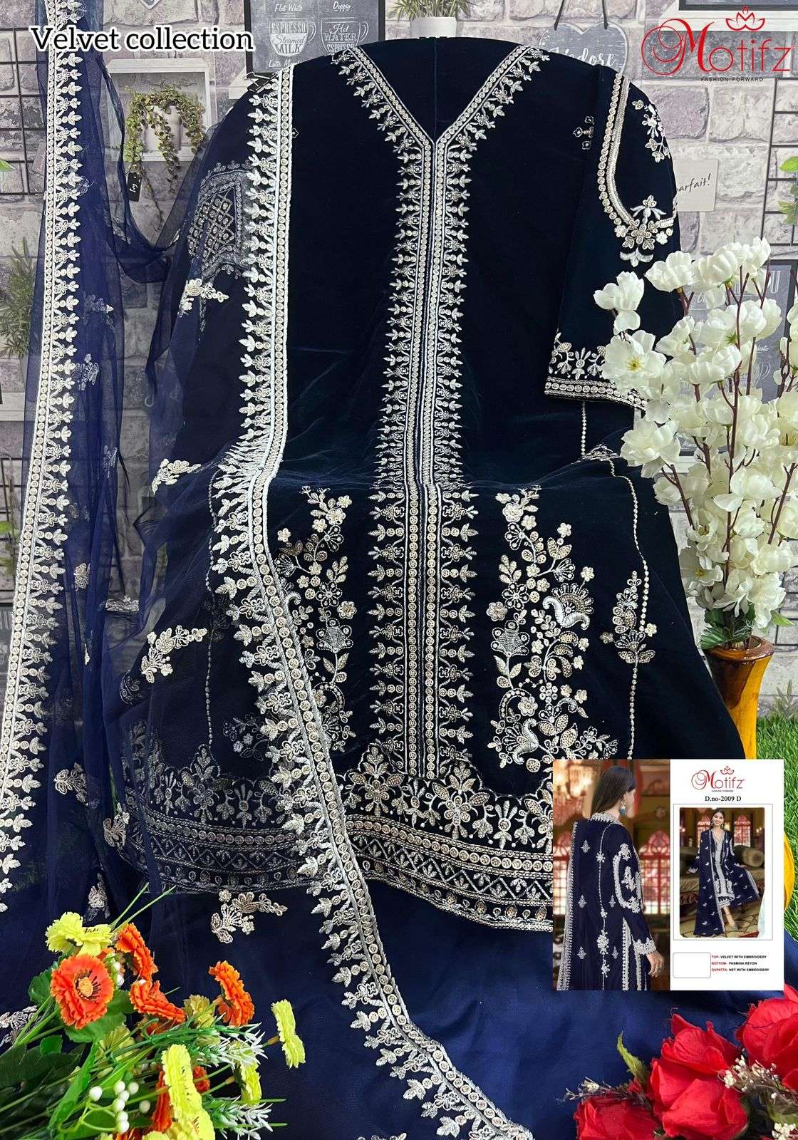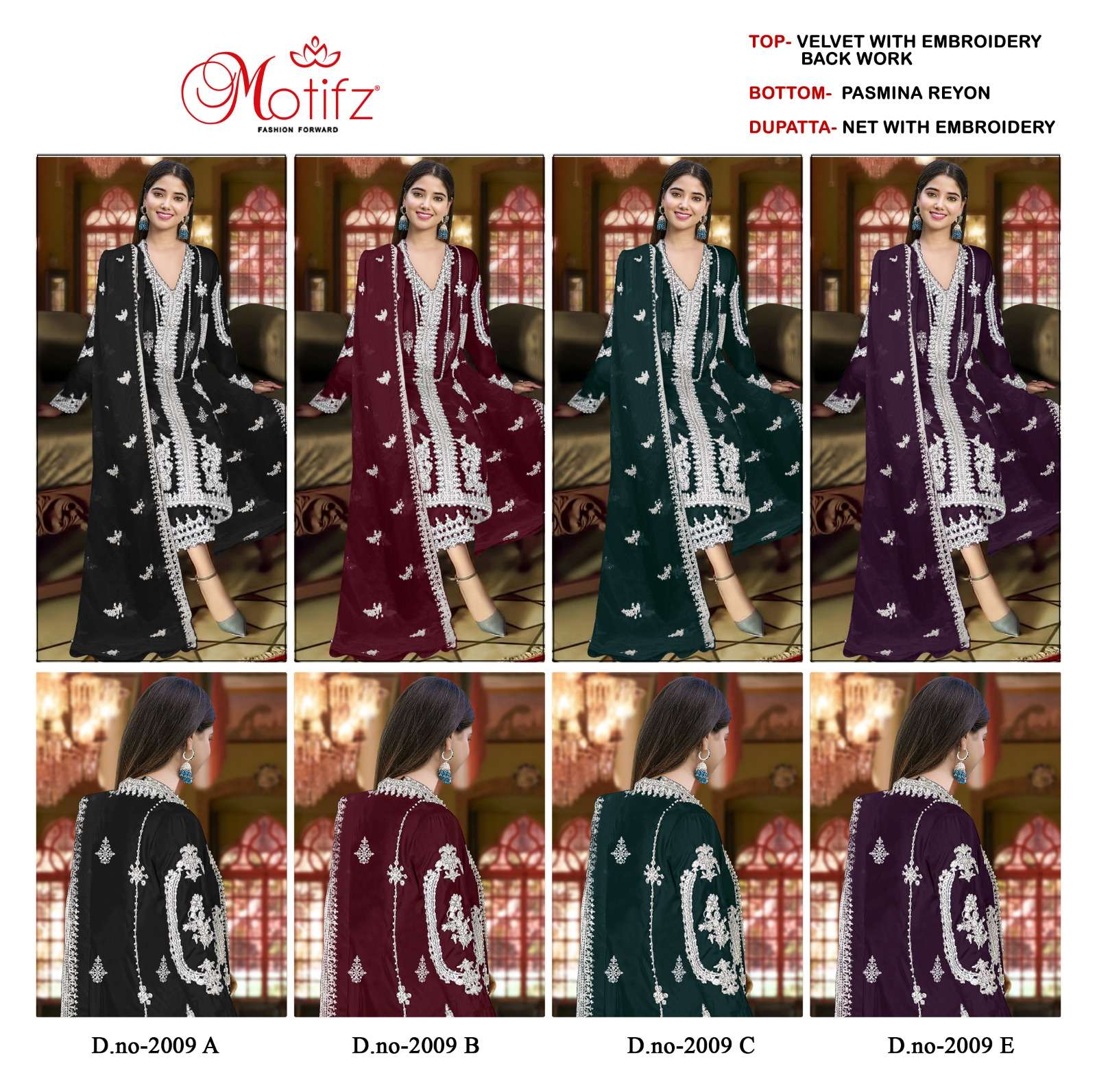 Buy Online MOTIFZ 2009 WINTER WEDDING WEAR VELVET EMBROIDERY WORK PAKISTANI SUIT EXPORT 4 Pcs of Full Catalogue at Wholesale Price. Looking for MOTIFZ 2009 WINTER WEDDING WEAR VELVET EMBROIDERY WORK PAKISTANI SUIT EXPORT Full Catalouge at Best Price? Buy Now MOTIFZ 2009 WINTER WEDDING WEAR VELVET EMBROIDERY WORK PAKISTANI SUIT EXPORT at Wholesale Rate of Rs 5200 with Total 4 Pcs from authroized dealer and supplier of MOTIFZ Brand. Cost of Each piece is just only Rs 1300 which is very low and affordable price to resale the product in your retail store Ethnic Export is Surat based Wholesale Supplier & Dealer of MOTIFZ Brand. Click on Brand name to Know more about MOTIFZ Brand's products.Call or Whatsapp on +91-9825759366 for booking or enquiry