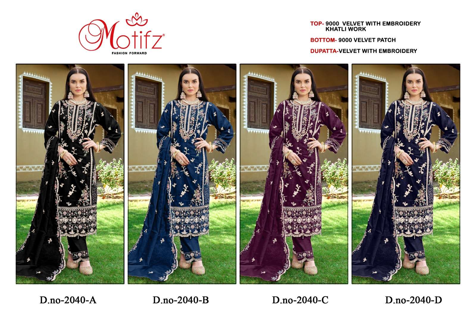 Buy Online MOTIFZ 2040 FUNCTION TYPE 9000 VELVET WITH EMBROIDERY WORK SALWAR SUIT EXPORT 4 Pcs of Full Catalogue at Wholesale Price. Looking for MOTIFZ 2040 FUNCTION TYPE 9000 VELVET WITH EMBROIDERY WORK SALWAR SUIT EXPORT Full Catalouge at Best Price? Buy Now MOTIFZ 2040 FUNCTION TYPE 9000 VELVET WITH EMBROIDERY WORK SALWAR SUIT EXPORT at Wholesale Rate of Rs 6600 with Total 4 Pcs from authroized dealer and supplier of MOTIFZ Brand. Cost of Each piece is just only Rs 1650 which is very low and affordable price to resale the product in your retail store Ethnic Export is Surat based Wholesale Supplier & Dealer of MOTIFZ Brand. Click on Brand name to Know more about MOTIFZ Brand's products.Call or Whatsapp on +91-9825759366 for booking or enquiry