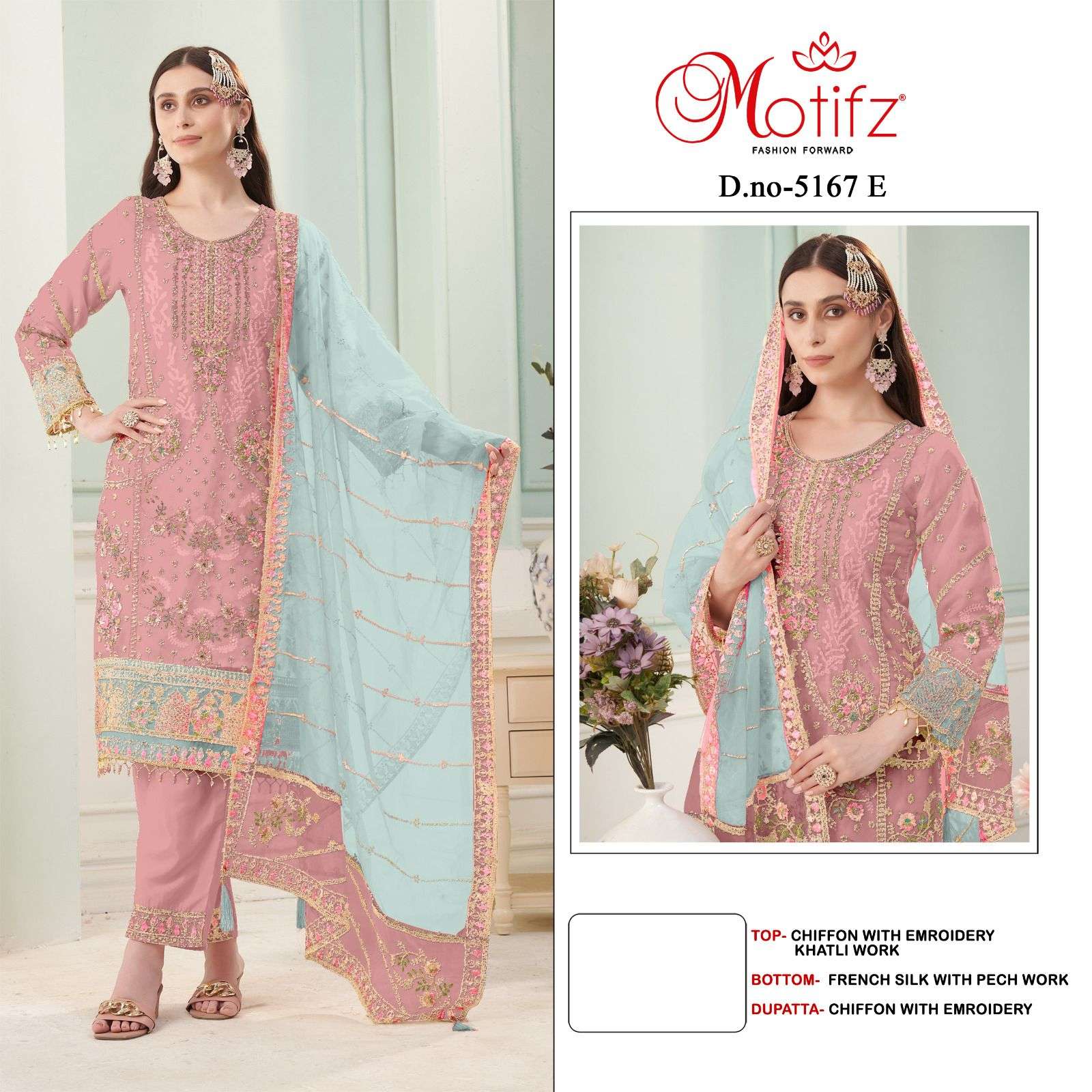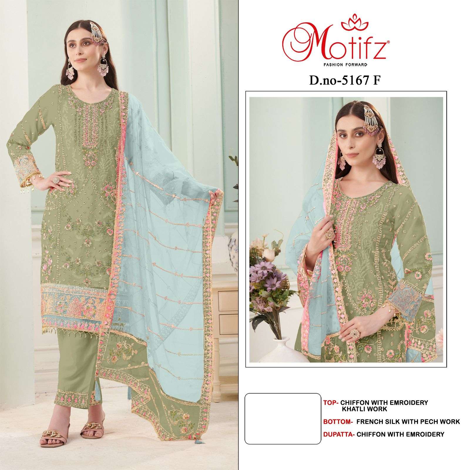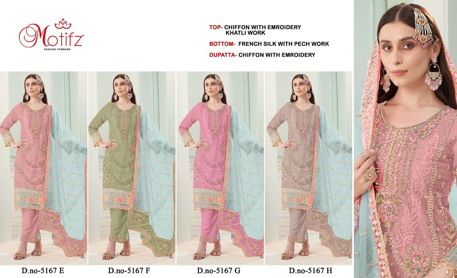 Buy Online MOTIFZ 5167 SIFFON WITH EMBROIDERY KHATLI WORK PAKISTANI TYPE DRESS RETAILER 4 Pcs of Full Catalogue at Wholesale Price. Looking for MOTIFZ 5167 SIFFON WITH EMBROIDERY KHATLI WORK PAKISTANI TYPE DRESS RETAILER Full Catalouge at Best Price? Buy Now MOTIFZ 5167 SIFFON WITH EMBROIDERY KHATLI WORK PAKISTANI TYPE DRESS RETAILER at Wholesale Rate of Rs 5500 with Total 4 Pcs from authroized dealer and supplier of MOTIFZ Brand. Cost of Each piece is just only Rs 1375 which is very low and affordable price to resale the product in your retail store Ethnic Export is Surat based Wholesale Supplier & Dealer of MOTIFZ Brand. Click on Brand name to Know more about MOTIFZ Brand's products.Call or Whatsapp on +91-9825759366 for booking or enquiry
