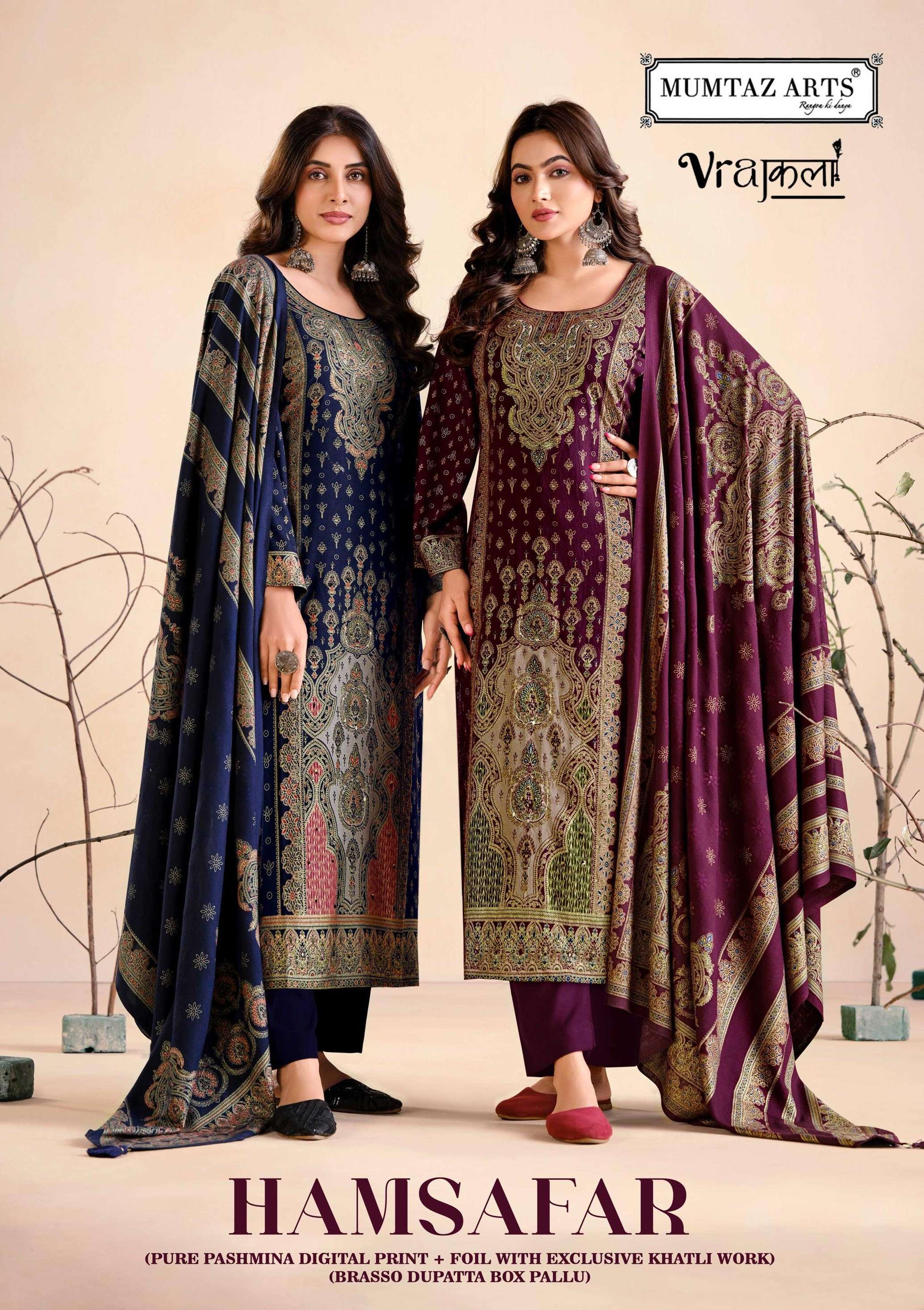 Buy Online MUMTAZ ARTS AASHVIKA SILK FABRIC PASHMINA DESIGNER SUIT REGULAR FASHION TRADER 5 Pcs of Full Catalogue at Wholesale Price. Looking for MUMTAZ ARTS AASHVIKA SILK FABRIC PASHMINA DESIGNER SUIT REGULAR FASHION TRADER Full Catalouge at Best Price? Buy Now MUMTAZ ARTS AASHVIKA SILK FABRIC PASHMINA DESIGNER SUIT REGULAR FASHION TRADER at Wholesale Rate of Rs 3075 with Total 5 Pcs from authroized dealer and supplier of Mumtaz Arts Brand. Cost of Each piece is just only Rs 615 which is very low and affordable price to resale the product in your retail store Ethnic Export is Surat based Wholesale Supplier & Dealer of Mumtaz Arts Brand. Click on Brand name to Know more about Mumtaz Arts Brand's products.Call or Whatsapp on +91-9825759366 for booking or enquiry