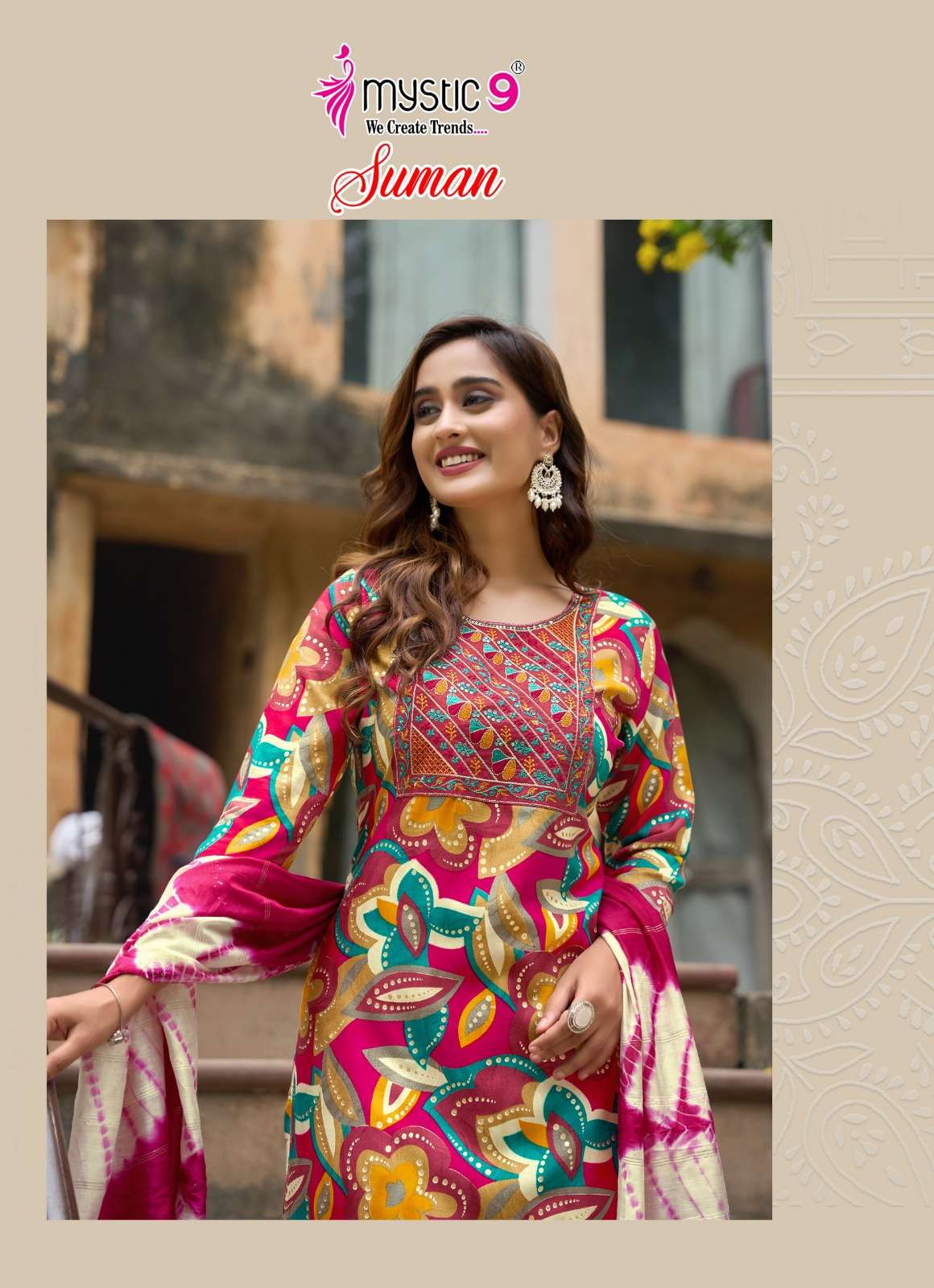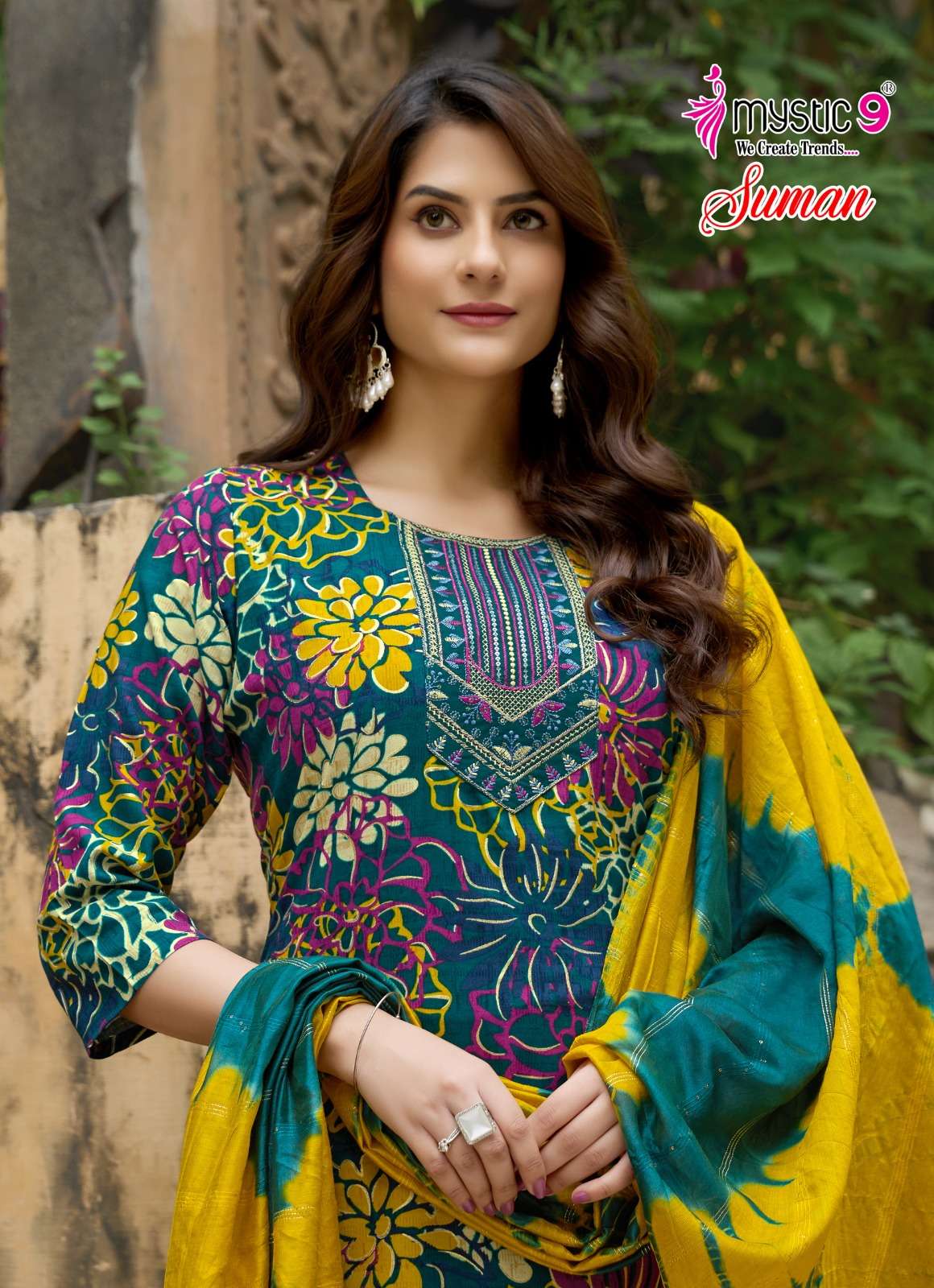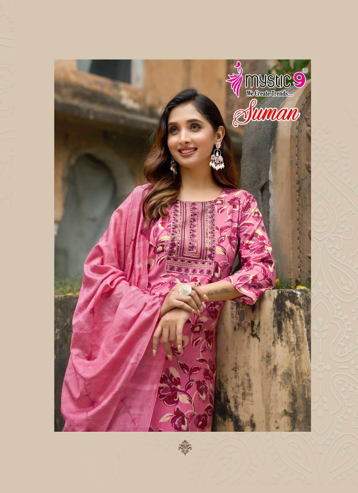 MYSTIC 9 SUMAN VOL 4 RAYON FOIL PRINT & SLEEVES EMBROIDERY SUIT FOR LADIES SUPPLIER
