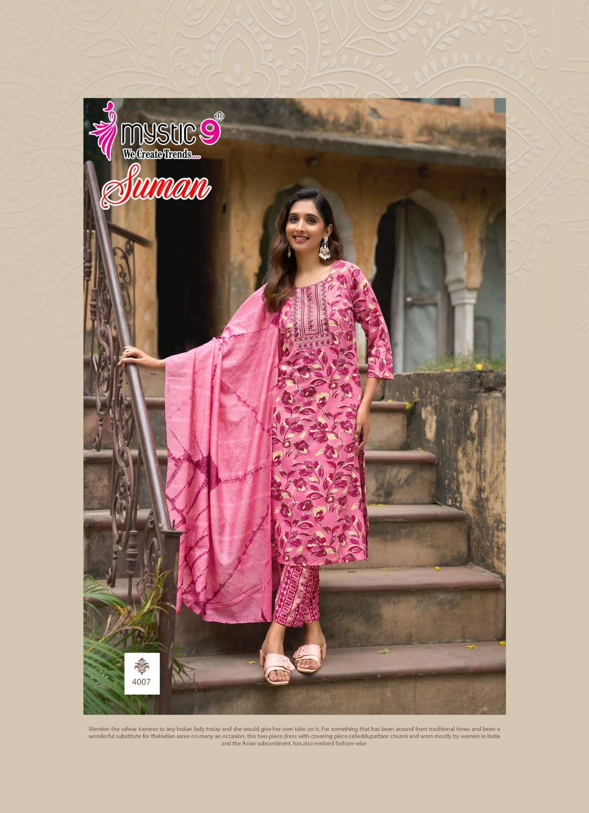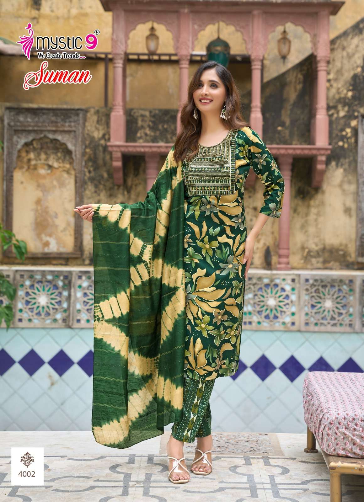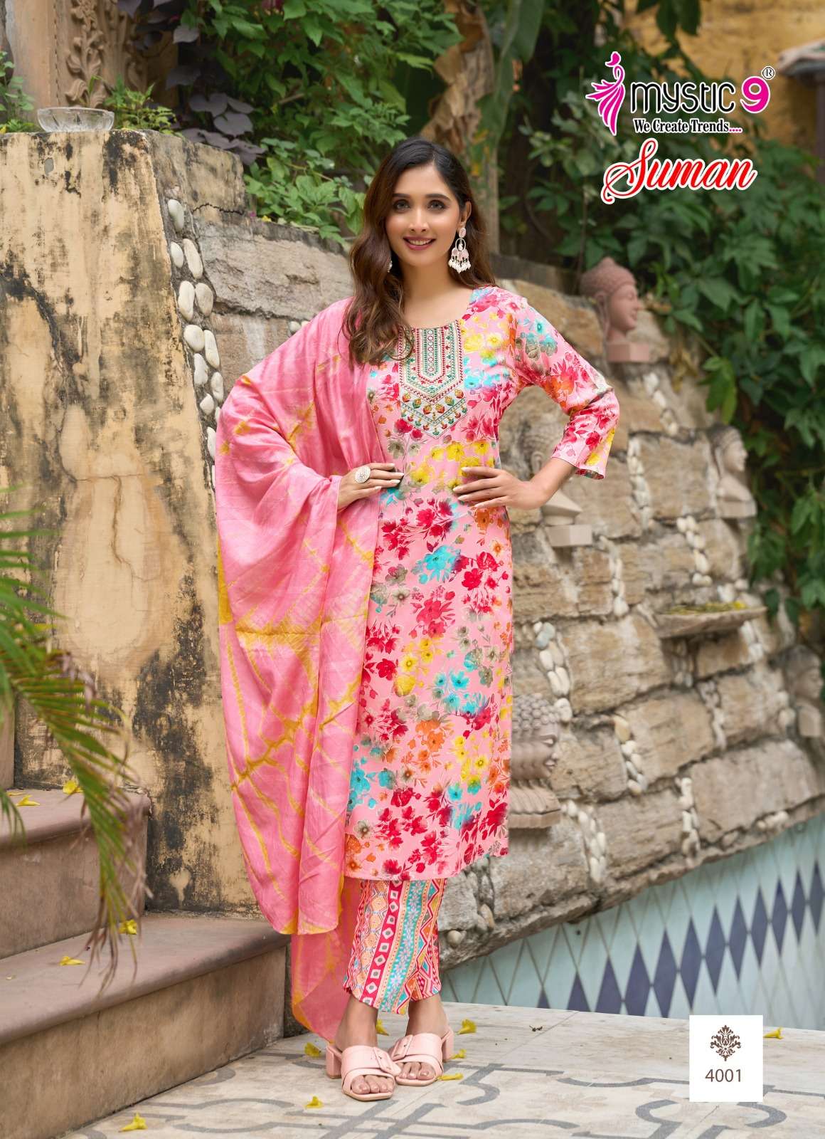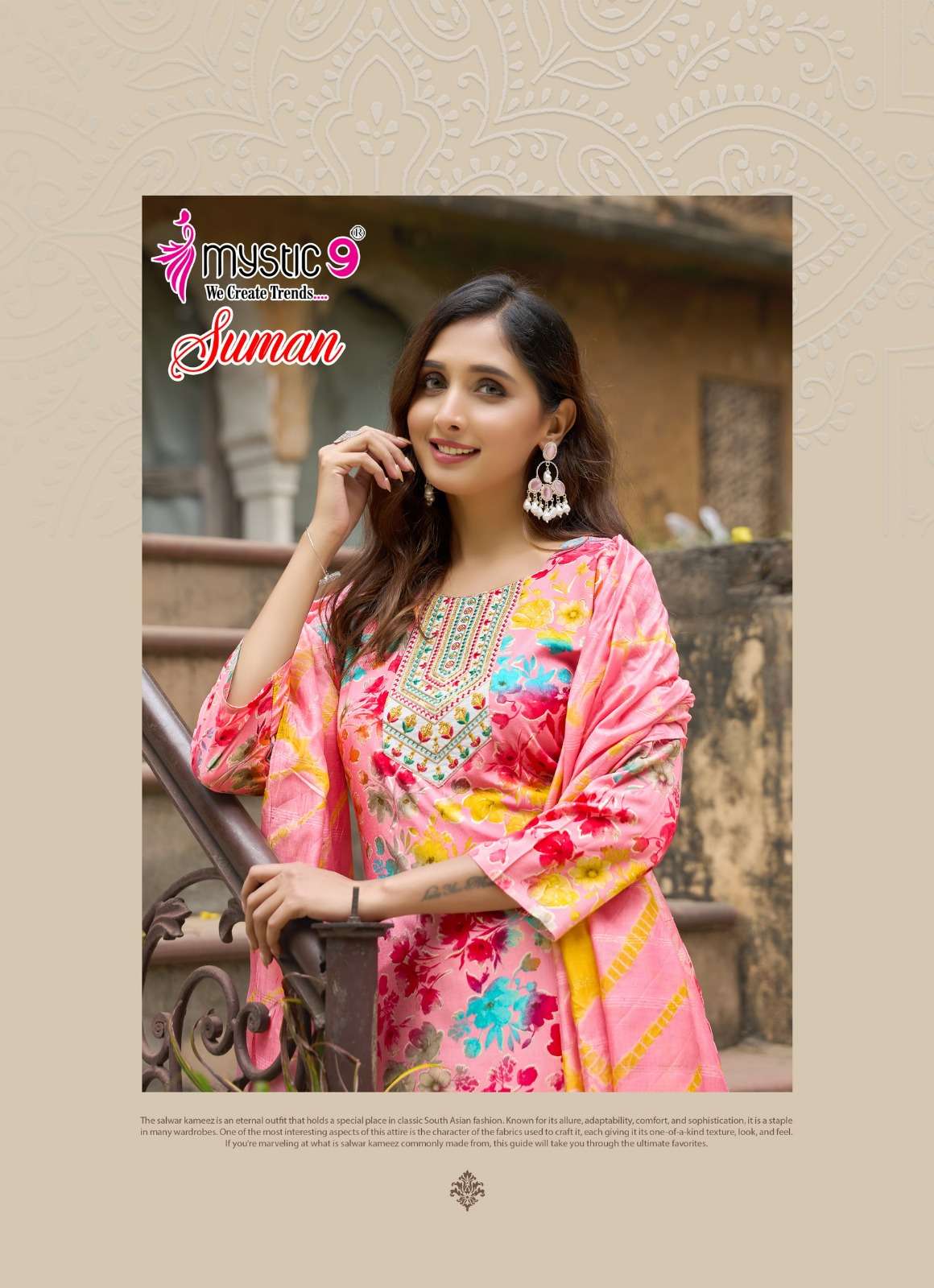 MYSTIC 9 SUMAN VOL 4 RAYON FOIL PRINT & SLEEVES EMBROIDERY SUIT FOR LADIES SUPPLIER