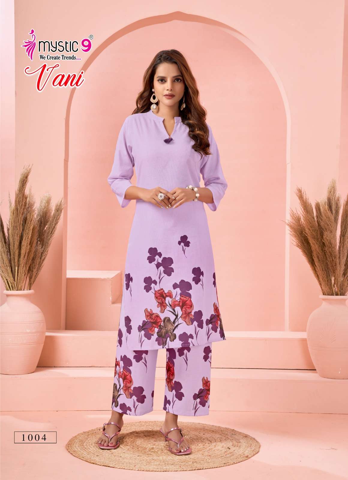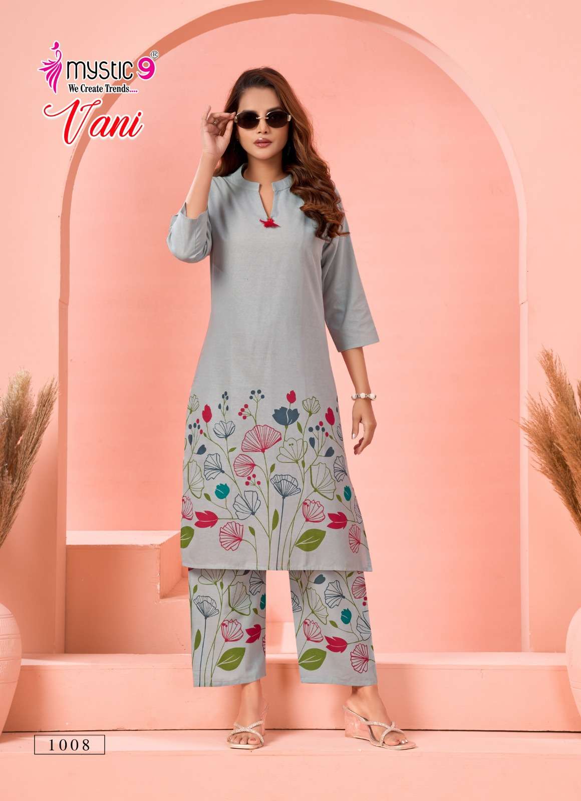 Buy Online MYSTIC 9 VANI VOL 1 PREMIUM COTTON FLEX PRINT MANDERIAN COLLAR CORD SET TO FESTIVAL EXPORT CLOTH 8 Pcs of Full Catalogue at Wholesale Price. Looking for MYSTIC 9 VANI VOL 1 PREMIUM COTTON FLEX PRINT MANDERIAN COLLAR CORD SET TO FESTIVAL EXPORT CLOTH Full Catalouge at Best Price? Buy Now MYSTIC 9 VANI VOL 1 PREMIUM COTTON FLEX PRINT MANDERIAN COLLAR CORD SET TO FESTIVAL EXPORT CLOTH at Wholesale Rate of Rs 3368 with Total 8 Pcs from authroized dealer and supplier of MYSTIC 9 Kurtis Brand. Cost of Each piece is just only Rs 421 which is very low and affordable price to resale the product in your retail store Ethnic Export is Surat based Wholesale Supplier & Dealer of MYSTIC 9 Kurtis Brand. Click on Brand name to Know more about MYSTIC 9 Kurtis Brand's products.Call or Whatsapp on +91-9825759366 for booking or enquiry