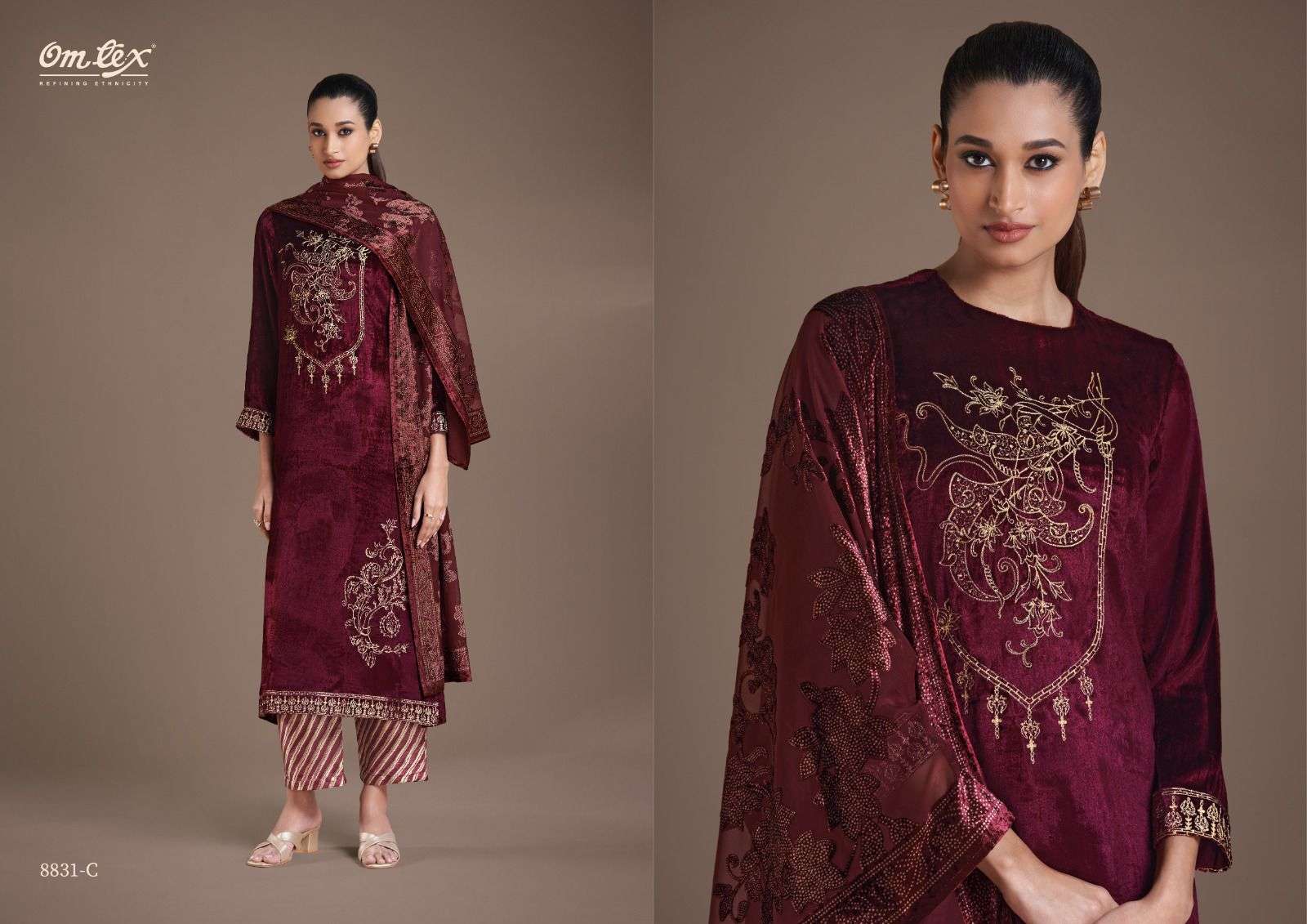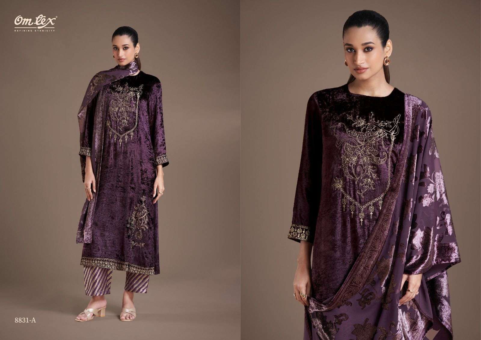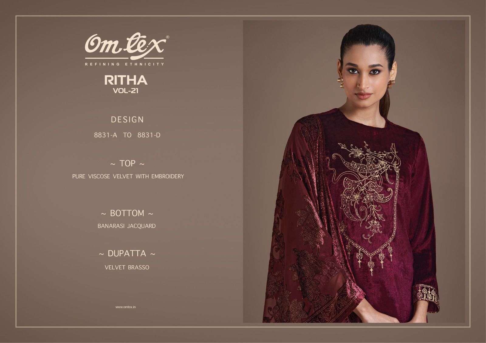 Buy Online OM TEX RITHA VOL 21 PURE VISCOSE VELVET WITH EMBROIDERY LADIES SUIT BEST COLLECTION 4 Pcs of Full Catalogue at Wholesale Price. Looking for OM TEX RITHA VOL 21 PURE VISCOSE VELVET WITH EMBROIDERY LADIES SUIT BEST COLLECTION Full Catalouge at Best Price? Buy Now OM TEX RITHA VOL 21 PURE VISCOSE VELVET WITH EMBROIDERY LADIES SUIT BEST COLLECTION at Wholesale Rate of Rs 10776 with Total 4 Pcs from authroized dealer and supplier of Om Tex Brand. Cost of Each piece is just only Rs 2694 which is very low and affordable price to resale the product in your retail store Ethnic Export is Surat based Wholesale Supplier & Dealer of Om Tex Brand. Click on Brand name to Know more about Om Tex Brand's products.Call or Whatsapp on +91-9825759366 for booking or enquiry