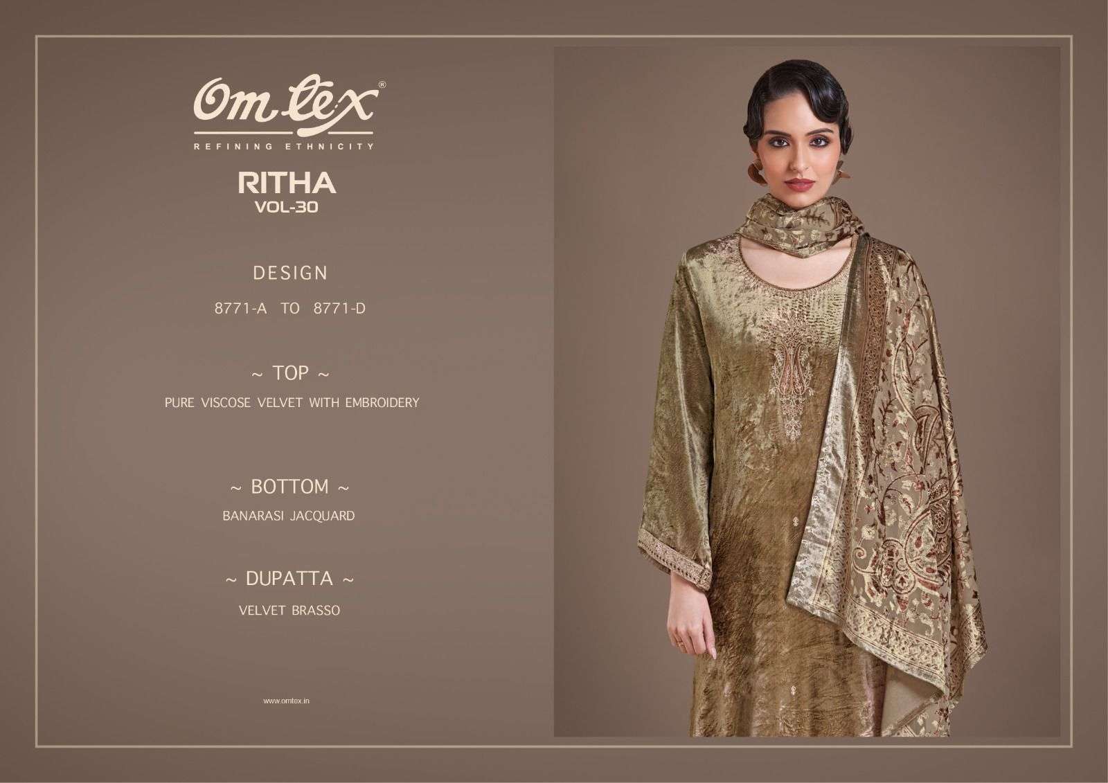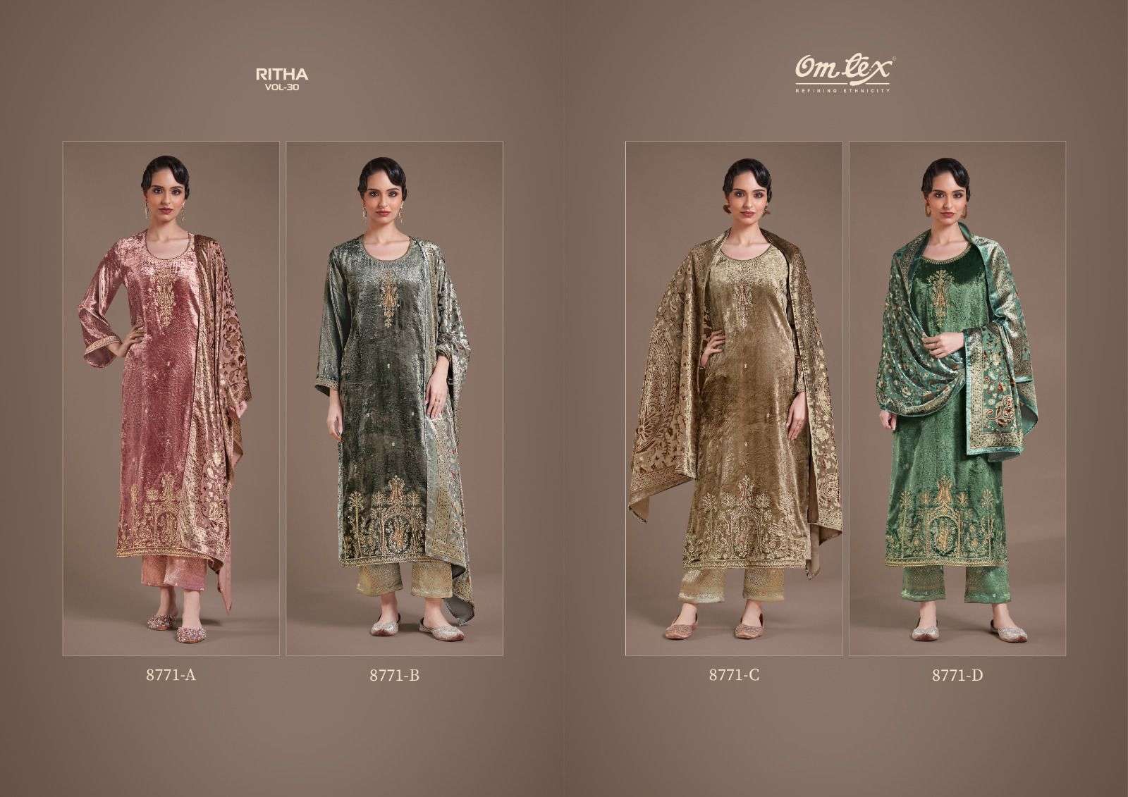 | Title | OM TEX RITHA VOL 30 VISCOSE VELVET EMBROIDERY DESIGN SUIT FOR LADIES FESTIVAL OUTFIT |