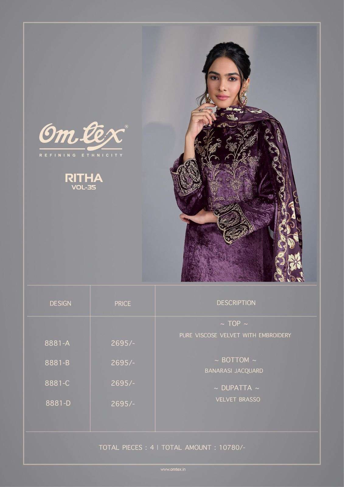 Buy Online OM TEX RITHA VOL 35 HIGH PARTY CLASSIC STYLE VELVET HEAVY WORK UNSTITCH SUIT CATALOG 4 Pcs of Full Catalogue at Wholesale Price. Looking for OM TEX RITHA VOL 35 HIGH PARTY CLASSIC STYLE VELVET HEAVY WORK UNSTITCH SUIT CATALOG Full Catalouge at Best Price? Buy Now OM TEX RITHA VOL 35 HIGH PARTY CLASSIC STYLE VELVET HEAVY WORK UNSTITCH SUIT CATALOG at Wholesale Rate of Rs 10780 with Total 4 Pcs from authroized dealer and supplier of Om Tex Brand. Cost of Each piece is just only Rs 2695 which is very low and affordable price to resale the product in your retail store Ethnic Export is Surat based Wholesale Supplier & Dealer of Om Tex Brand. Click on Brand name to Know more about Om Tex Brand's products.Call or Whatsapp on +91-9825759366 for booking or enquiry