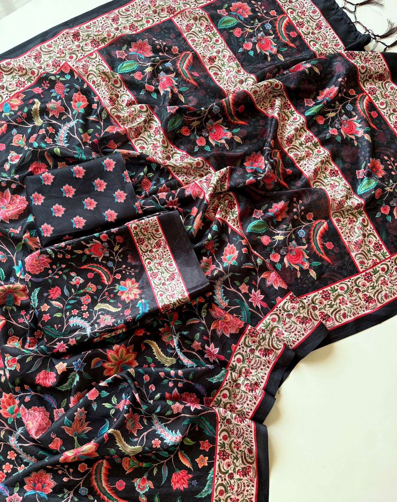 Fabric - Pure Soft Dola Silk Fabric And Beautiful Dark Color Matching With Mill Print And Sequence Work Border And Running Blouse Single also available |