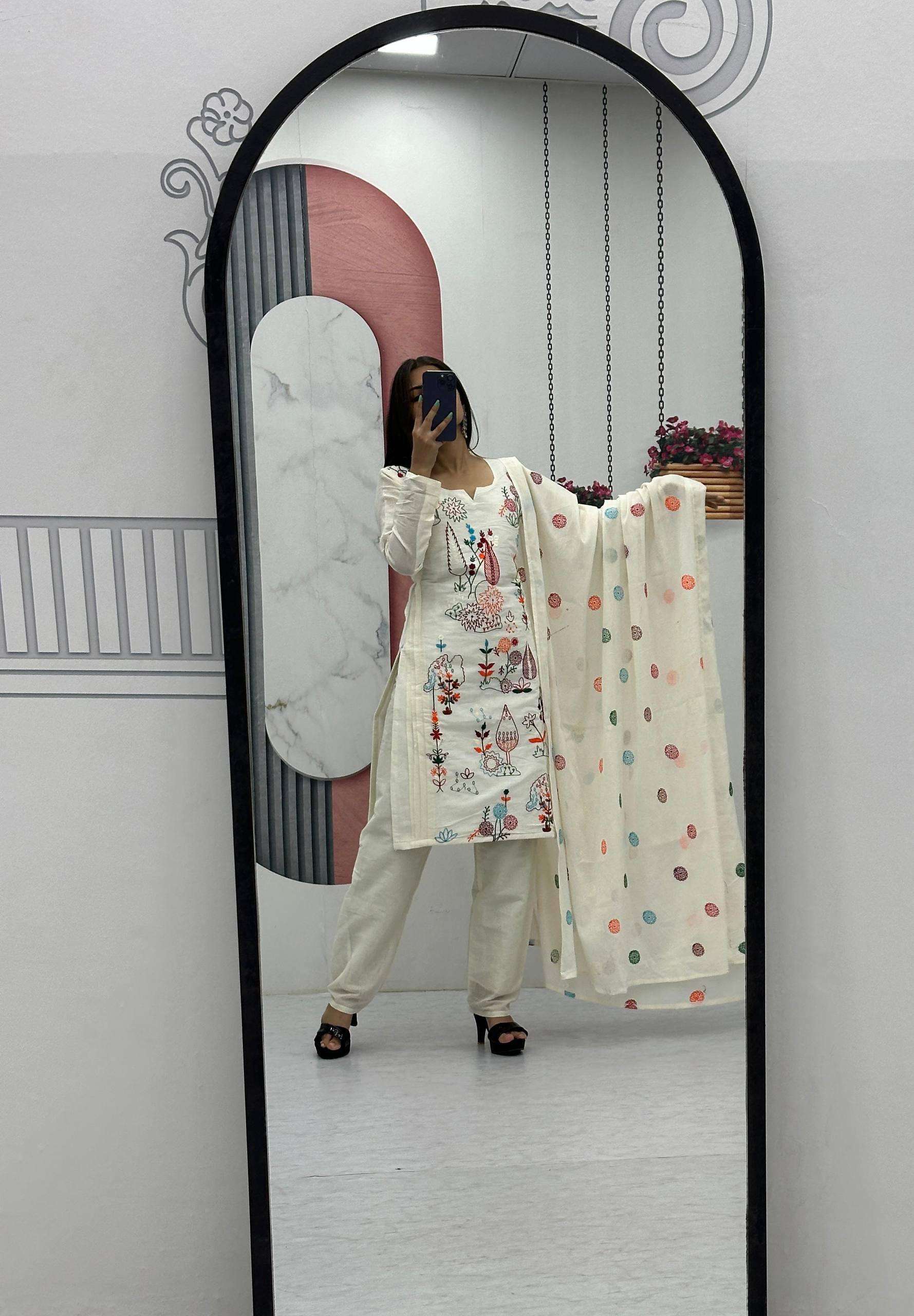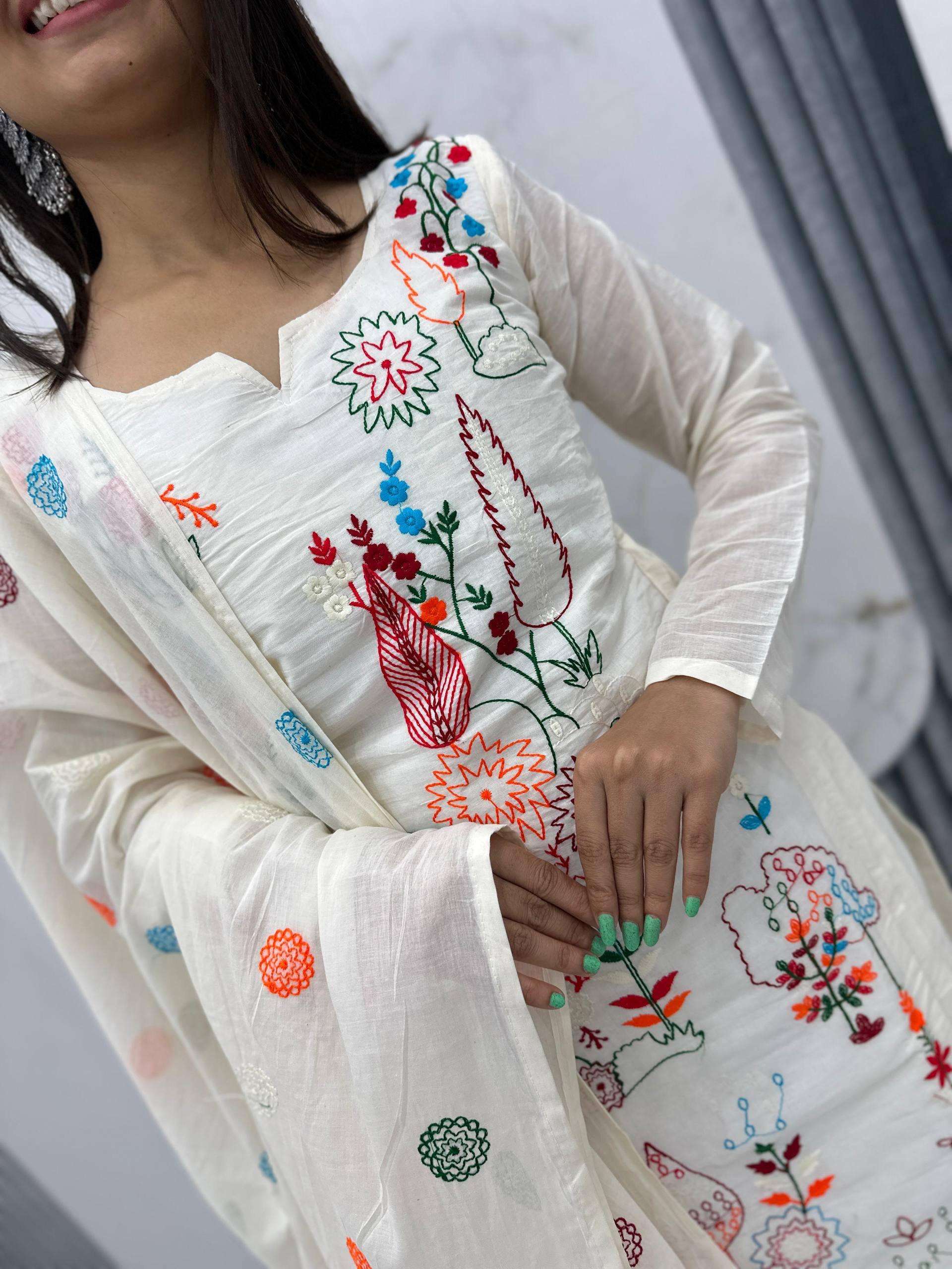 | Title | Pf 042 Cotton fabric white shades with multiple color design embroidery work Best Collection |