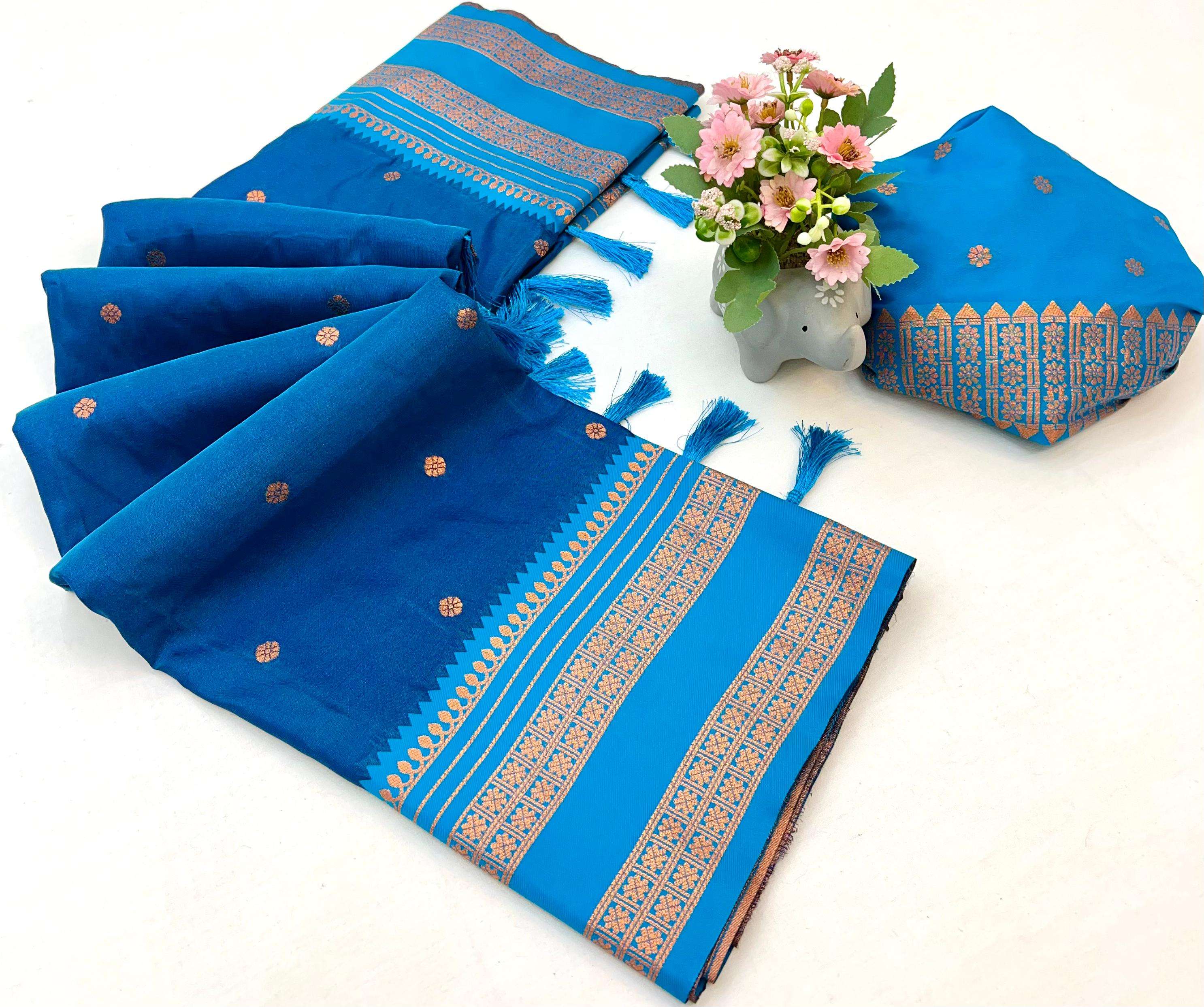 Soft Silk Sarees Premium Two Tone Fabric with Narayan Border dual zari motifs all over the body having Rich woven contrast Zari Pallu and contrast zari woven unique concept border paired with Contrast blouse same as shown in video 12 Premium Colour SINGLE ALSO AVAILABLE |