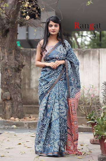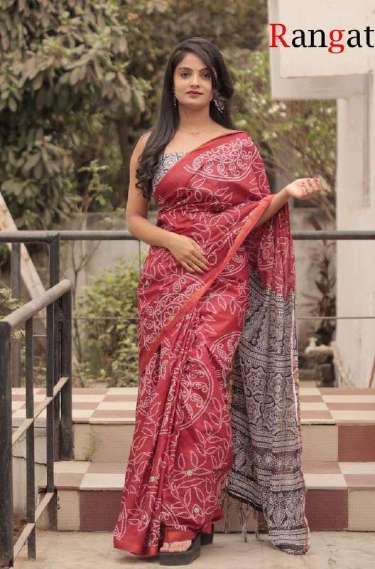 _❀Catalog :~Rangt( रँगत )❀_* FABRICS : *Soft Pure Cotton with golden Weaving* SAREES : *6.30 MTR PURE COTTON BANDHANI AND AJRAK BLOCK PRINT SAREES WITH BLOUSE PICE* *BLOUSE :~ Sem as show in photo*