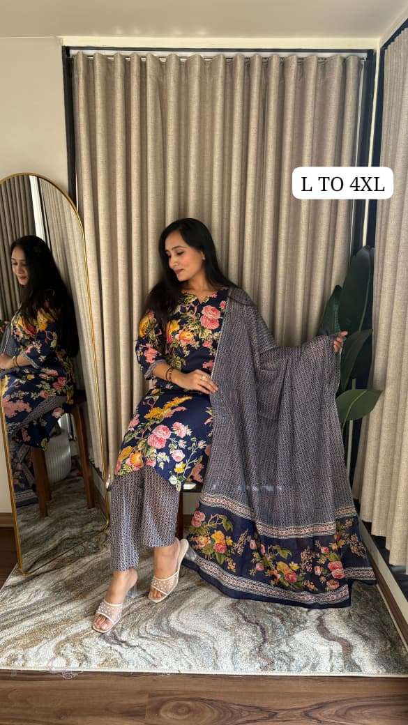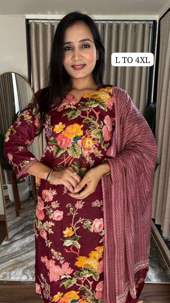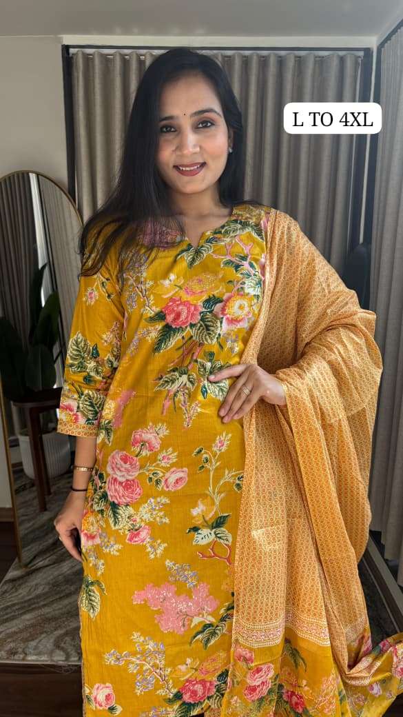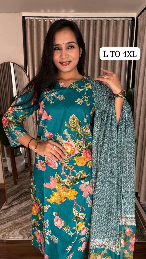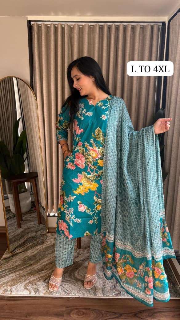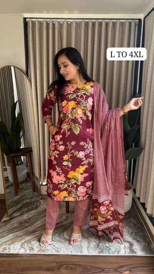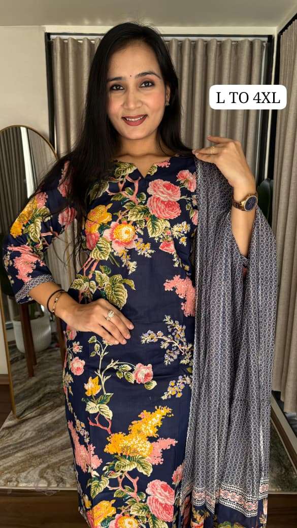 Top :- pure cemric jaipuri 60-60 cotton print top with pocket Pent :- pure cemric jaipuri 60-60 cotton print pent with miyani Dupatta :- pure mul mul print pattern :- straight cut consept Size :- L to 4xl…. SINGLE ALSO AVA |