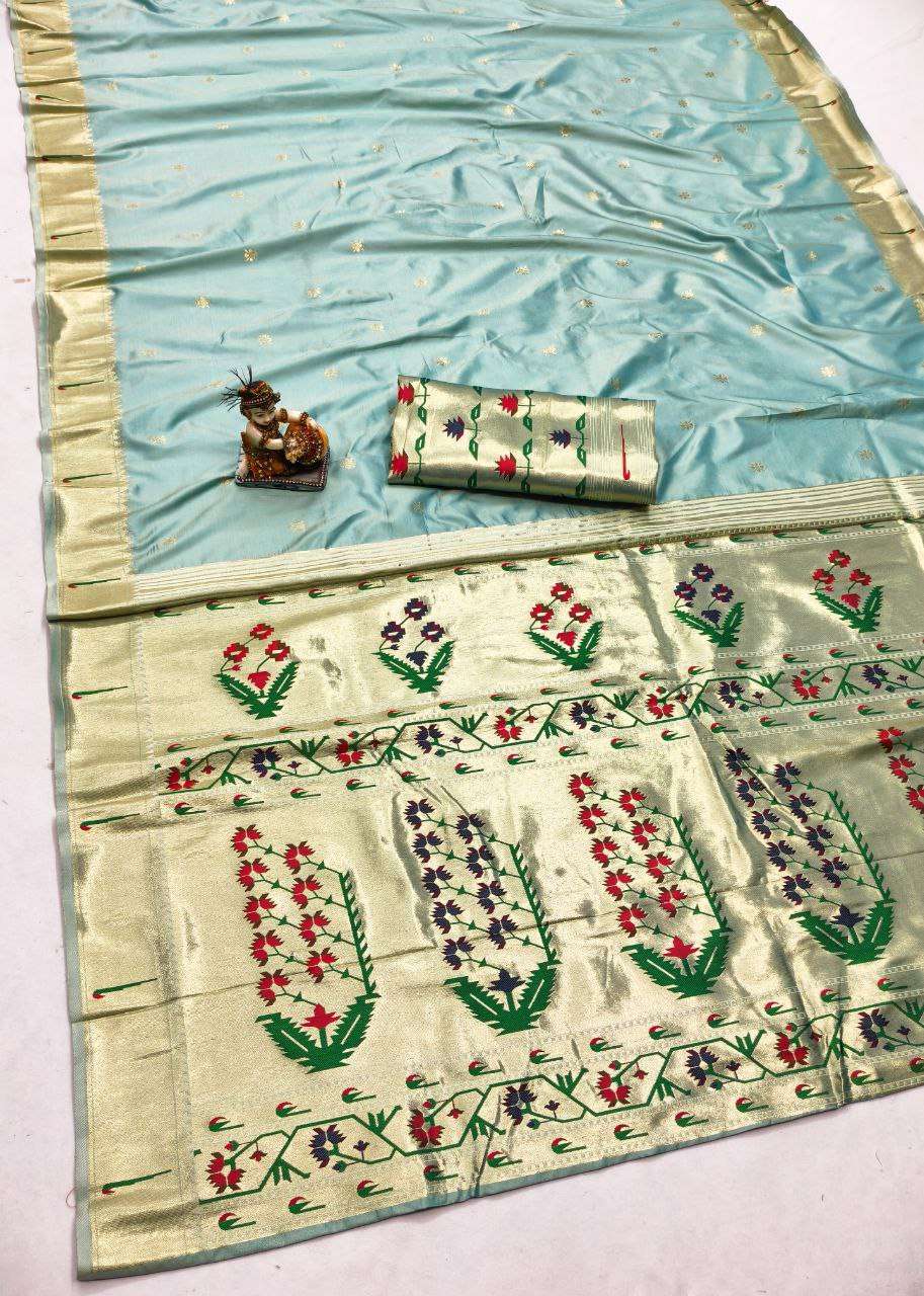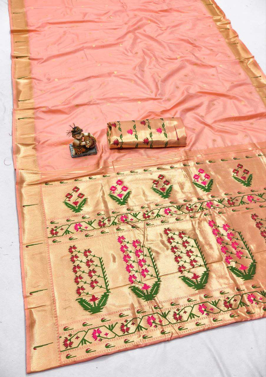 🧶Fabric :- Paithani Lichi Silk saree with beautiful design, muniya border with allover gold jari butti weaving and nice pallu. 🧵Blouse :- Color matching *Brocade* blouse *Twenty Unique Colors* SINGLE ALSO AVA |