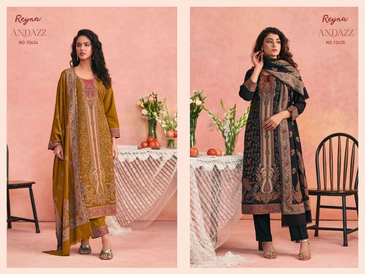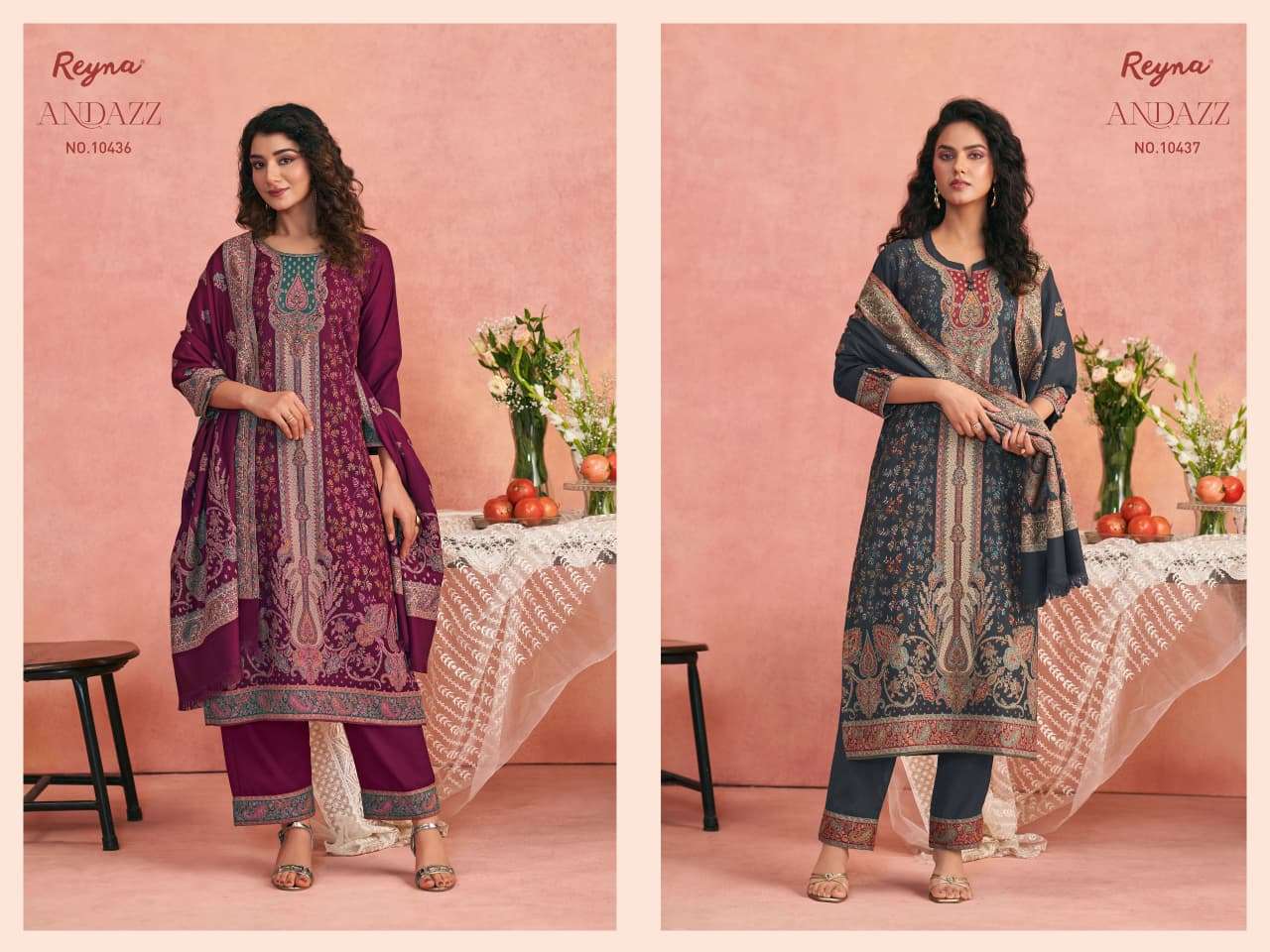 Buy Online REYNA ANDAZZ WOOL PASHMINA MEENA JACQUARD WITH HANDWORK SUIT RESELLER SHOP 4 Pcs of Full Catalogue at Wholesale Price. Looking for REYNA ANDAZZ WOOL PASHMINA MEENA JACQUARD WITH HANDWORK SUIT RESELLER SHOP Full Catalouge at Best Price? Buy Now REYNA ANDAZZ WOOL PASHMINA MEENA JACQUARD WITH HANDWORK SUIT RESELLER SHOP at Wholesale Rate of Rs 9180 with Total 4 Pcs from authroized dealer and supplier of REYNA Brand. Cost of Each piece is just only Rs 2295 which is very low and affordable price to resale the product in your retail store Ethnic Export is Surat based Wholesale Supplier & Dealer of REYNA Brand. Click on Brand name to Know more about REYNA Brand's products.Call or Whatsapp on +91-9825759366 for booking or enquiry