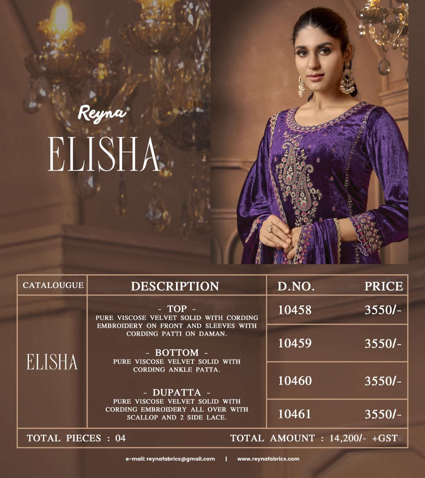 Buy Online REYNA ELISHA WEDDING & FESTIVAL CLOTH WOMEN VELVET CORDING WORK HEAVY SUIT RESELLER 4 Pcs of Full Catalogue at Wholesale Price. Looking for REYNA ELISHA WEDDING & FESTIVAL CLOTH WOMEN VELVET CORDING WORK HEAVY SUIT RESELLER Full Catalouge at Best Price? Buy Now REYNA ELISHA WEDDING & FESTIVAL CLOTH WOMEN VELVET CORDING WORK HEAVY SUIT RESELLER at Wholesale Rate of Rs 14200 with Total 4 Pcs from authroized dealer and supplier of REYNA Brand. Cost of Each piece is just only Rs 3550 which is very low and affordable price to resale the product in your retail store Ethnic Export is Surat based Wholesale Supplier & Dealer of REYNA Brand. Click on Brand name to Know more about REYNA Brand's products.Call or Whatsapp on +91-9825759366 for booking or enquiry