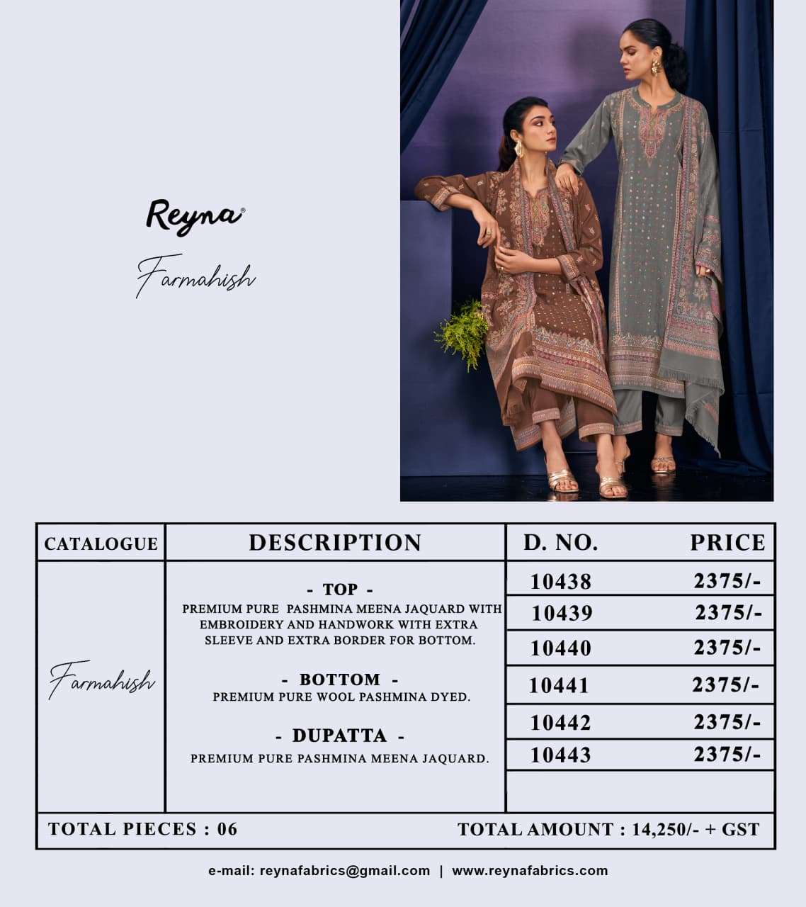 Buy Online REYNA FARMAHISH PREMIUM WINTER PASHMINA DESIGN UNSTITCH SALWAR SUIT EXPORT 4 Pcs of Full Catalogue at Wholesale Price. Looking for REYNA FARMAHISH PREMIUM WINTER PASHMINA DESIGN UNSTITCH SALWAR SUIT EXPORT Full Catalouge at Best Price? Buy Now REYNA FARMAHISH PREMIUM WINTER PASHMINA DESIGN UNSTITCH SALWAR SUIT EXPORT at Wholesale Rate of Rs 9500 with Total 4 Pcs from authroized dealer and supplier of REYNA Brand. Cost of Each piece is just only Rs 2375 which is very low and affordable price to resale the product in your retail store Ethnic Export is Surat based Wholesale Supplier & Dealer of REYNA Brand. Click on Brand name to Know more about REYNA Brand's products.Call or Whatsapp on +91-9825759366 for booking or enquiry