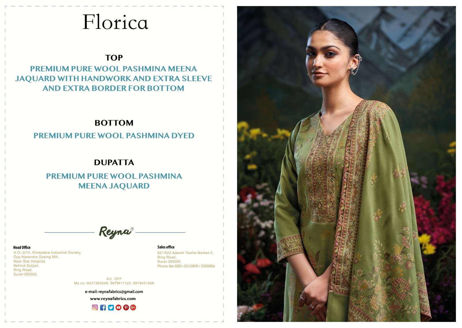 Buy Online REYNA FLORICA PREMIUM PASHMINA MEENA JACQUARD PRINT SUIT TO UNSTITCH EXPORT 6 Pcs of Full Catalogue at Wholesale Price. Looking for REYNA FLORICA PREMIUM PASHMINA MEENA JACQUARD PRINT SUIT TO UNSTITCH EXPORT Full Catalouge at Best Price? Buy Now REYNA FLORICA PREMIUM PASHMINA MEENA JACQUARD PRINT SUIT TO UNSTITCH EXPORT at Wholesale Rate of Rs 13770 with Total 6 Pcs from authroized dealer and supplier of REYNA Brand. Cost of Each piece is just only Rs 2295 which is very low and affordable price to resale the product in your retail store Ethnic Export is Surat based Wholesale Supplier & Dealer of REYNA Brand. Click on Brand name to Know more about REYNA Brand's products.Call or Whatsapp on +91-9825759366 for booking or enquiry