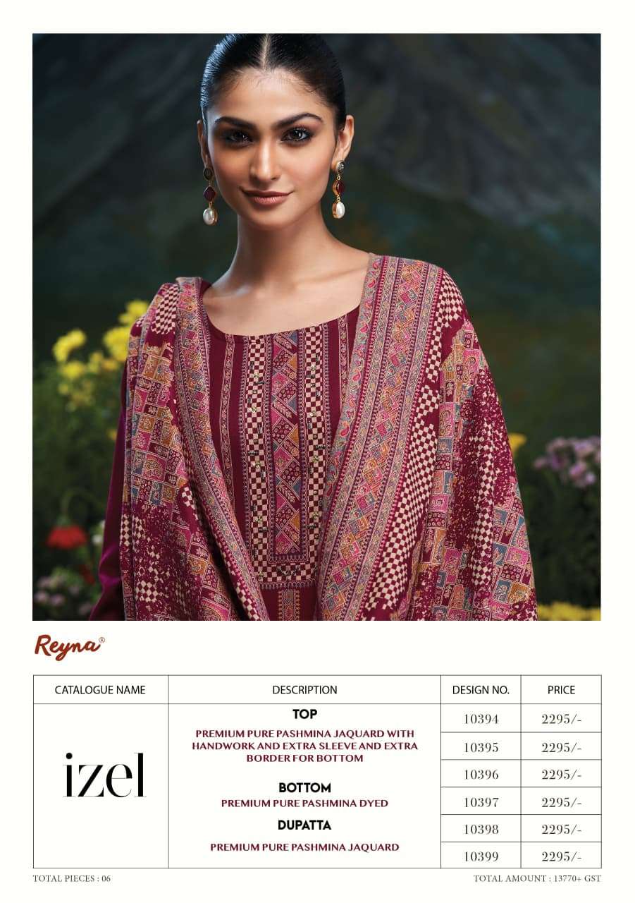 Buy Online REYNA IZEL PREMIUM PURE PASHMINA JACQUARD EXTRA DESIGN SUIT TO MATERIAL EXPORT 5 Pcs of Full Catalogue at Wholesale Price. Looking for REYNA IZEL PREMIUM PURE PASHMINA JACQUARD EXTRA DESIGN SUIT TO MATERIAL EXPORT Full Catalouge at Best Price? Buy Now REYNA IZEL PREMIUM PURE PASHMINA JACQUARD EXTRA DESIGN SUIT TO MATERIAL EXPORT at Wholesale Rate of Rs 11475 with Total 5 Pcs from authroized dealer and supplier of REYNA Brand. Cost of Each piece is just only Rs 2295 which is very low and affordable price to resale the product in your retail store Ethnic Export is Surat based Wholesale Supplier & Dealer of REYNA Brand. Click on Brand name to Know more about REYNA Brand's products.Call or Whatsapp on +91-9825759366 for booking or enquiry