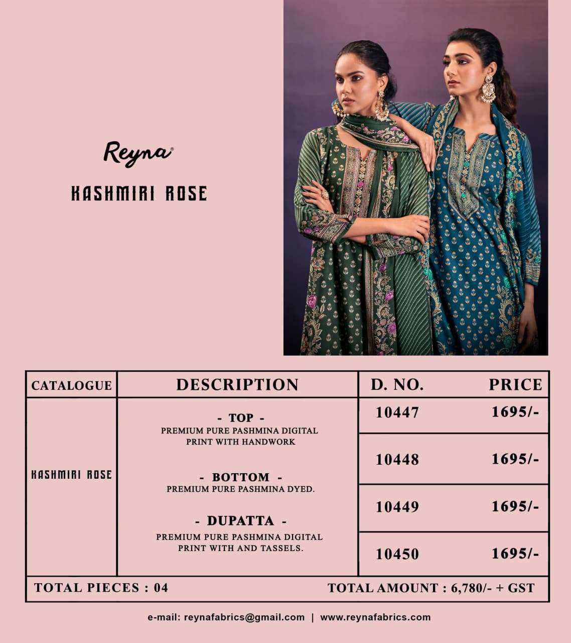Buy Online REYNA KASHMIRI ROSE PREMIUM PASHMINA DIGITAL MATERIAL SUIT FOR FESTIVAL INDIAN DEALER 4 Pcs of Full Catalogue at Wholesale Price. Looking for REYNA KASHMIRI ROSE PREMIUM PASHMINA DIGITAL MATERIAL SUIT FOR FESTIVAL INDIAN DEALER Full Catalouge at Best Price? Buy Now REYNA KASHMIRI ROSE PREMIUM PASHMINA DIGITAL MATERIAL SUIT FOR FESTIVAL INDIAN DEALER at Wholesale Rate of Rs 6780 with Total 4 Pcs from authroized dealer and supplier of REYNA Brand. Cost of Each piece is just only Rs 1695 which is very low and affordable price to resale the product in your retail store Ethnic Export is Surat based Wholesale Supplier & Dealer of REYNA Brand. Click on Brand name to Know more about REYNA Brand's products.Call or Whatsapp on +91-9825759366 for booking or enquiry