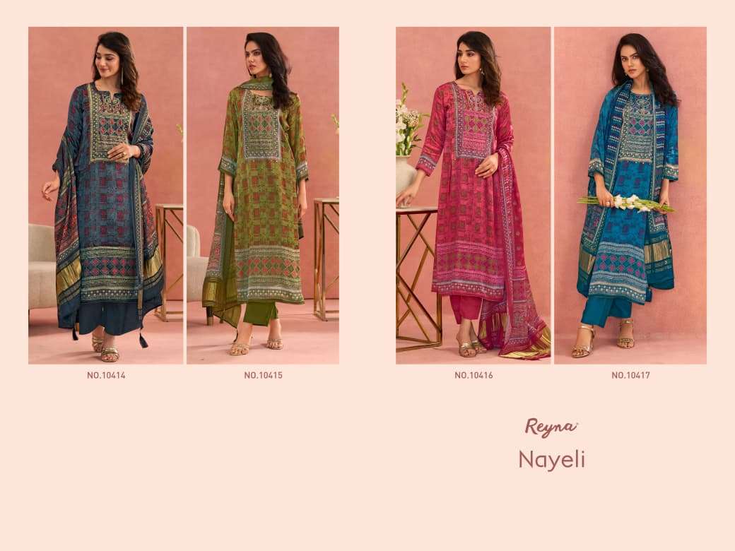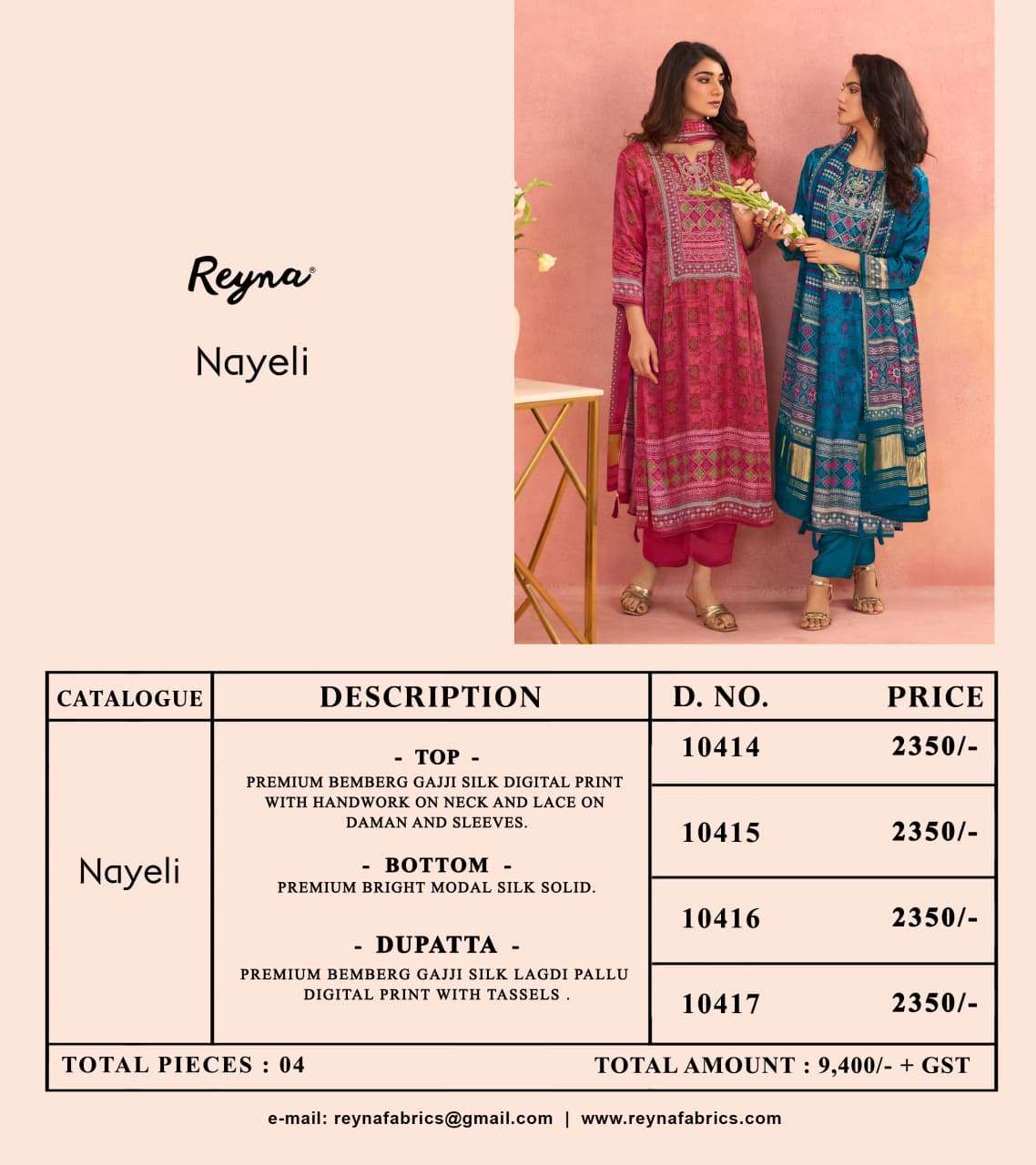 Buy Online REYNA NAYELI PREMIUM BEMBERG GAJJI SILK DESIGNER SUIT FOR WOMEN EXPORT 4 Pcs of Full Catalogue at Wholesale Price. Looking for REYNA NAYELI PREMIUM BEMBERG GAJJI SILK DESIGNER SUIT FOR WOMEN EXPORT Full Catalouge at Best Price? Buy Now REYNA NAYELI PREMIUM BEMBERG GAJJI SILK DESIGNER SUIT FOR WOMEN EXPORT at Wholesale Rate of Rs 9400 with Total 4 Pcs from authroized dealer and supplier of REYNA Brand. Cost of Each piece is just only Rs 2350 which is very low and affordable price to resale the product in your retail store Ethnic Export is Surat based Wholesale Supplier & Dealer of REYNA Brand. Click on Brand name to Know more about REYNA Brand's products.Call or Whatsapp on +91-9825759366 for booking or enquiry
