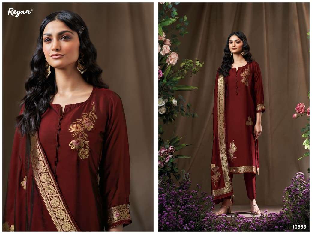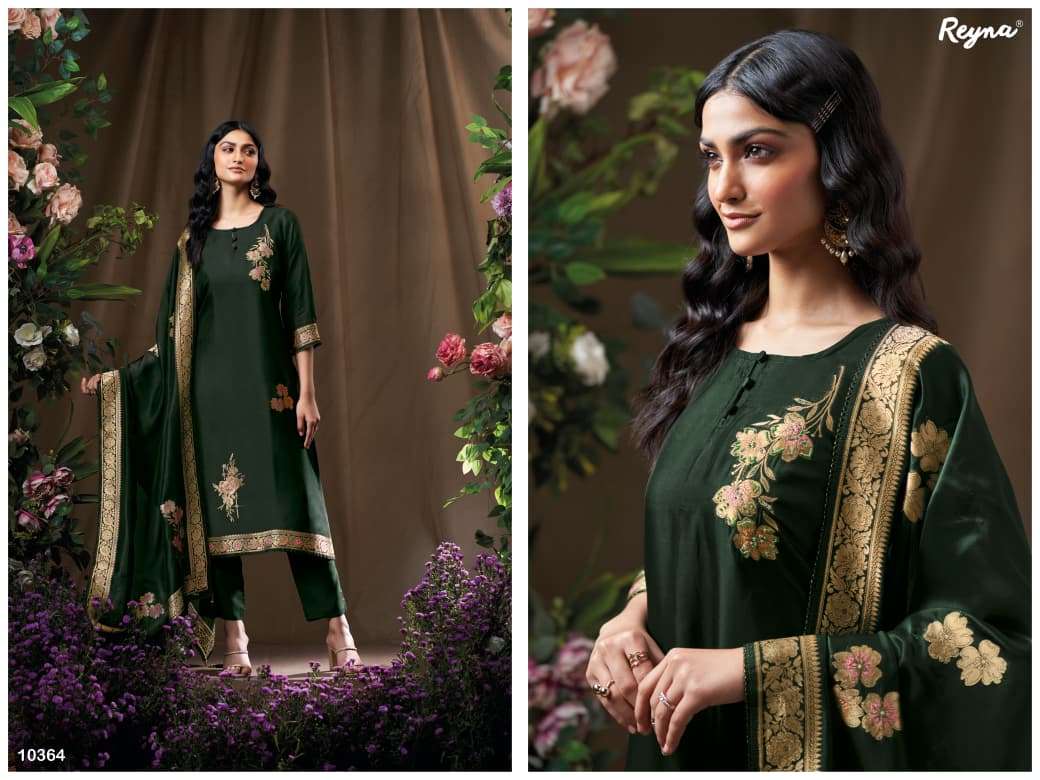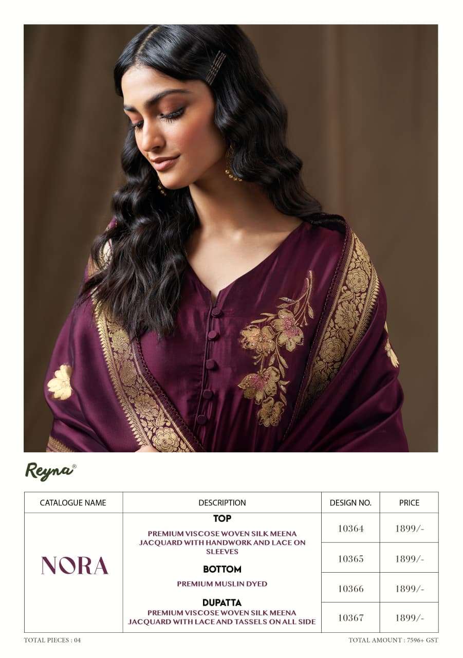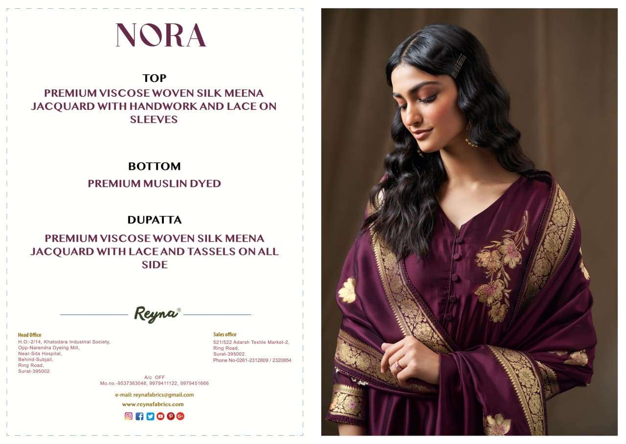 Buy Online REYNA NORA PREMIUM BOUTIQUE WOVEN SILK MEENA JACQUARD PATTERN SUIT TRADER 4 Pcs of Full Catalogue at Wholesale Price. Looking for REYNA NORA PREMIUM BOUTIQUE WOVEN SILK MEENA JACQUARD PATTERN SUIT TRADER Full Catalouge at Best Price? Buy Now REYNA NORA PREMIUM BOUTIQUE WOVEN SILK MEENA JACQUARD PATTERN SUIT TRADER at Wholesale Rate of Rs 7596 with Total 4 Pcs from authroized dealer and supplier of REYNA Brand. Cost of Each piece is just only Rs 1899 which is very low and affordable price to resale the product in your retail store Ethnic Export is Surat based Wholesale Supplier & Dealer of REYNA Brand. Click on Brand name to Know more about REYNA Brand's products.Call or Whatsapp on +91-9825759366 for booking or enquiry