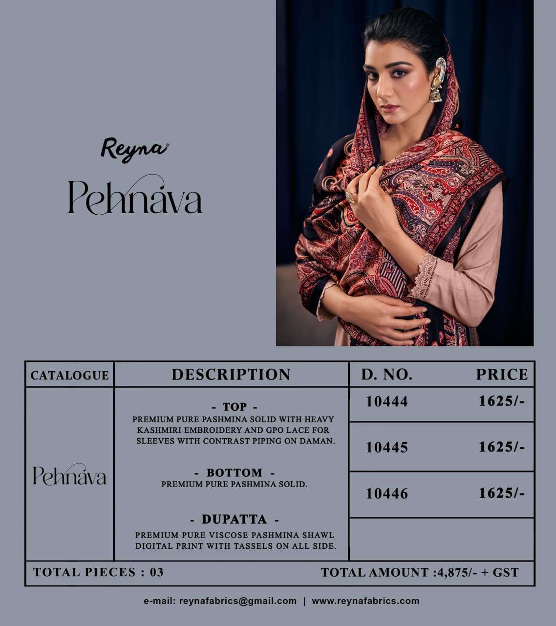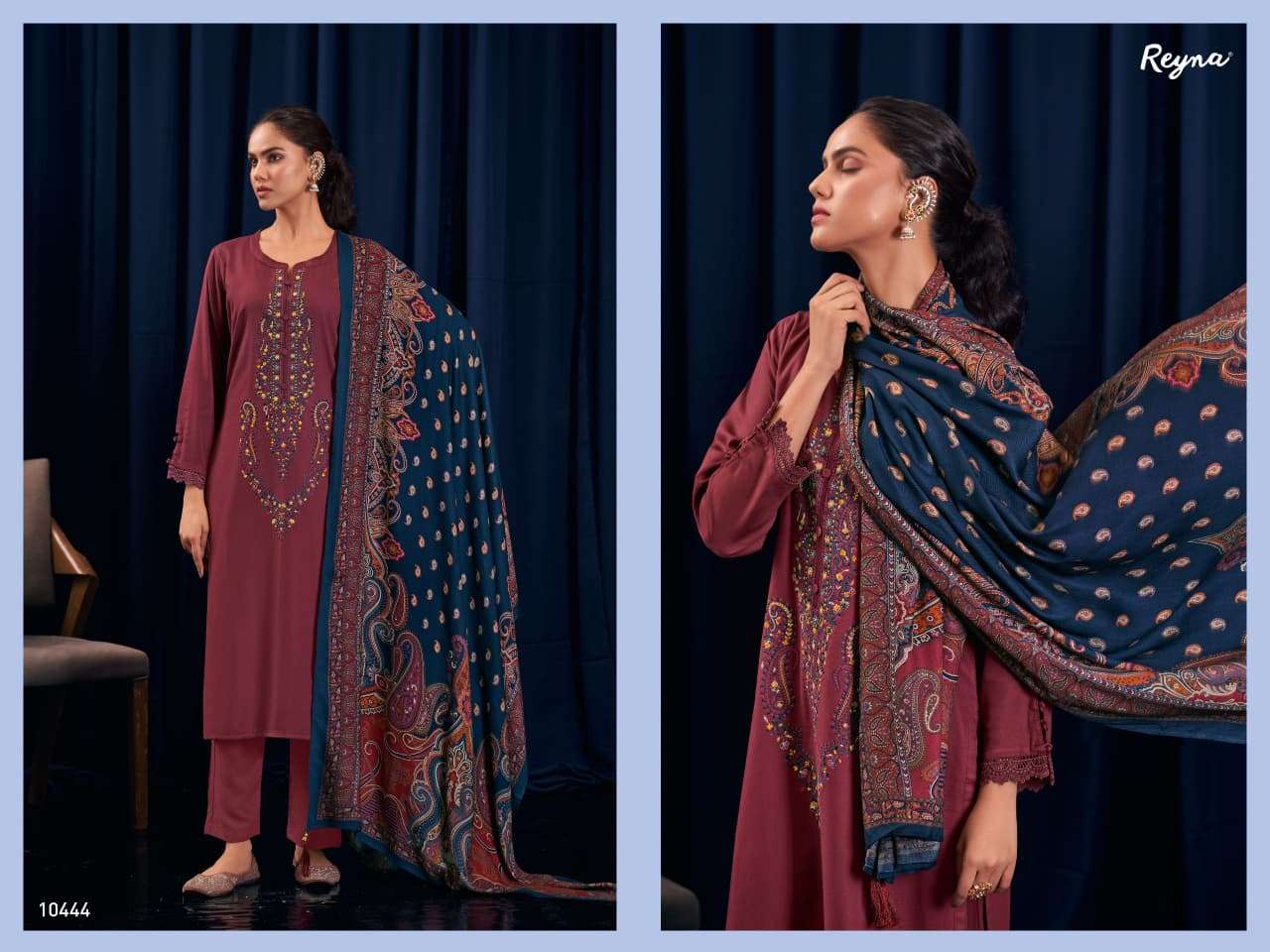 Buy Online REYNA PEHNAVA PREMIUM PASHMINA SOLID KASHMIR WORK SUIT FOR WOMEN SUPPLIER SURAT 3 Pcs of Full Catalogue at Wholesale Price. Looking for REYNA PEHNAVA PREMIUM PASHMINA SOLID KASHMIR WORK SUIT FOR WOMEN SUPPLIER SURAT Full Catalouge at Best Price? Buy Now REYNA PEHNAVA PREMIUM PASHMINA SOLID KASHMIR WORK SUIT FOR WOMEN SUPPLIER SURAT at Wholesale Rate of Rs 4875 with Total 3 Pcs from authroized dealer and supplier of REYNA Brand. Cost of Each piece is just only Rs 1625 which is very low and affordable price to resale the product in your retail store Ethnic Export is Surat based Wholesale Supplier & Dealer of REYNA Brand. Click on Brand name to Know more about REYNA Brand's products.Call or Whatsapp on +91-9825759366 for booking or enquiry