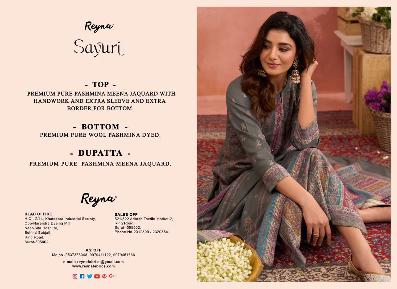 Buy Online REYNA SAYURI PURE PASHMINA MEENA JACQUARD PRINT KAMEEZ SUIT AT RESELLER 6 Pcs of Full Catalogue at Wholesale Price. Looking for REYNA SAYURI PURE PASHMINA MEENA JACQUARD PRINT KAMEEZ SUIT AT RESELLER Full Catalouge at Best Price? Buy Now REYNA SAYURI PURE PASHMINA MEENA JACQUARD PRINT KAMEEZ SUIT AT RESELLER at Wholesale Rate of Rs 13770 with Total 6 Pcs from authroized dealer and supplier of REYNA Brand. Cost of Each piece is just only Rs 2295 which is very low and affordable price to resale the product in your retail store Ethnic Export is Surat based Wholesale Supplier & Dealer of REYNA Brand. Click on Brand name to Know more about REYNA Brand's products.Call or Whatsapp on +91-9825759366 for booking or enquiry