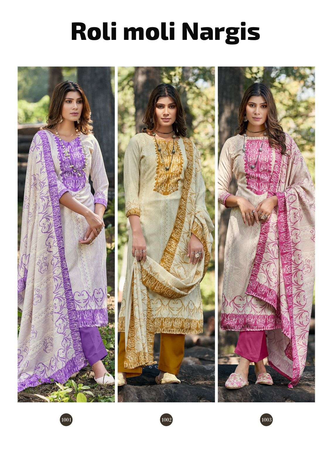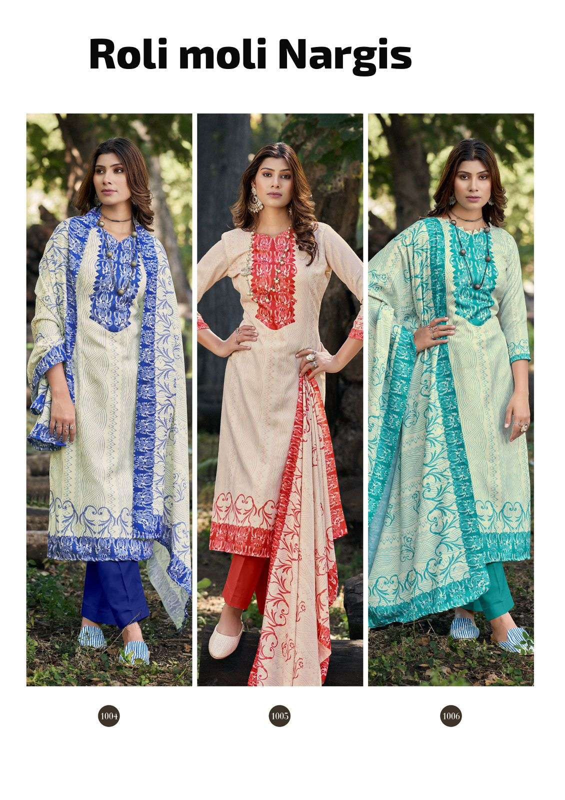 Buy Online ROLI MOLI CREATION NARGIS PASHMINA FLOWER PRINT WORK SALWAR SUIT INDIA 6 Pcs of Full Catalogue at Wholesale Price. Looking for ROLI MOLI CREATION NARGIS PASHMINA FLOWER PRINT WORK SALWAR SUIT INDIA Full Catalouge at Best Price? Buy Now ROLI MOLI CREATION NARGIS PASHMINA FLOWER PRINT WORK SALWAR SUIT INDIA at Wholesale Rate of Rs 2550 with Total 6 Pcs from authroized dealer and supplier of RolI Moli Brand. Cost of Each piece is just only Rs 425 which is very low and affordable price to resale the product in your retail store Ethnic Export is Surat based Wholesale Supplier & Dealer of RolI Moli Brand. Click on Brand name to Know more about RolI Moli Brand's products.Call or Whatsapp on +91-9825759366 for booking or enquiry