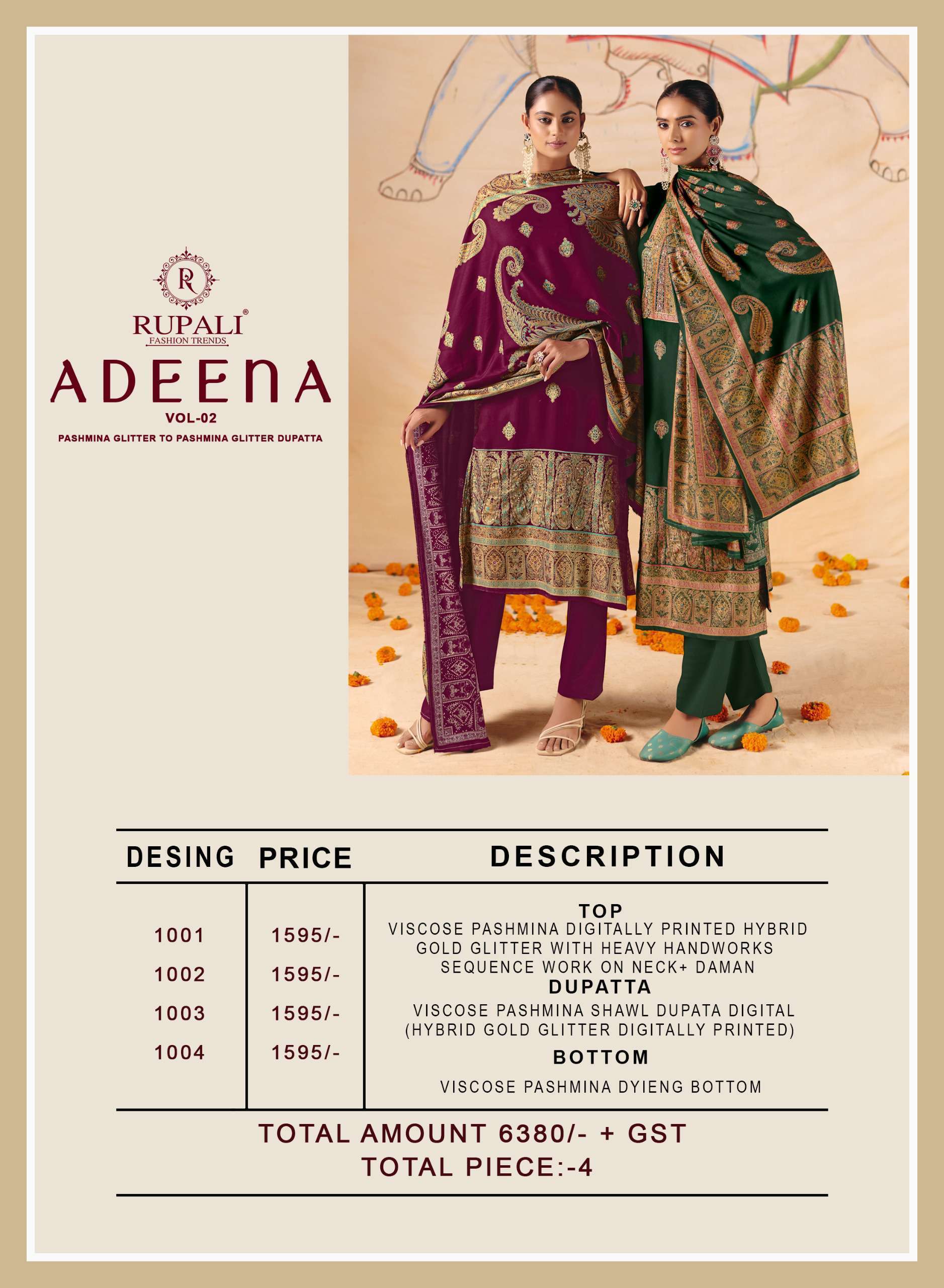 Buy Online RUPALI FASHION ADEENA VOL 2 WINTER WEAR PASHMINA DESIGNER 3 PIECE SUIT EXPORT 4 Pcs of Full Catalogue at Wholesale Price. Looking for RUPALI FASHION ADEENA VOL 2 WINTER WEAR PASHMINA DESIGNER 3 PIECE SUIT EXPORT Full Catalouge at Best Price? Buy Now RUPALI FASHION ADEENA VOL 2 WINTER WEAR PASHMINA DESIGNER 3 PIECE SUIT EXPORT at Wholesale Rate of Rs 6380 with Total 4 Pcs from authroized dealer and supplier of RUPALI FASHION Brand. Cost of Each piece is just only Rs 1595 which is very low and affordable price to resale the product in your retail store Ethnic Export is Surat based Wholesale Supplier & Dealer of RUPALI FASHION Brand. Click on Brand name to Know more about RUPALI FASHION Brand's products.Call or Whatsapp on +91-9825759366 for booking or enquiry