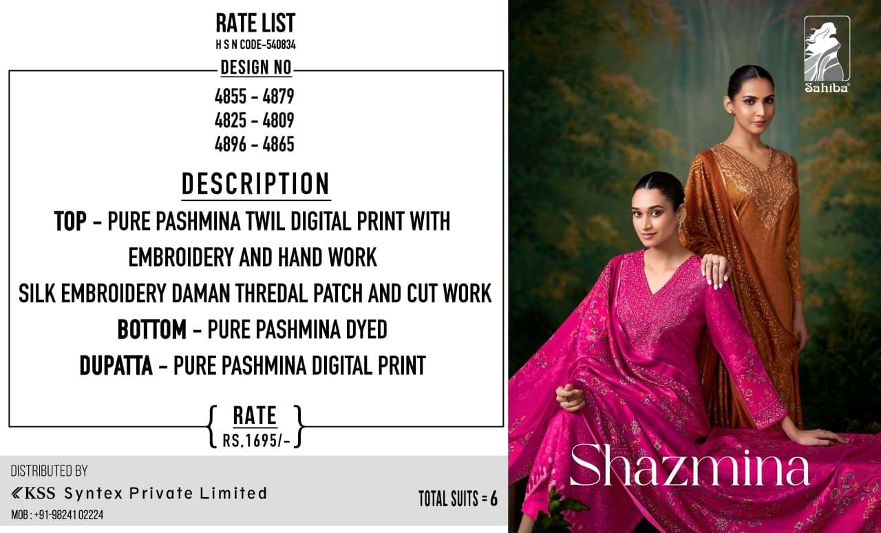 Buy Online SAHIBA SHAZMINA PASHMINA TWIL DIGITAL PRINT WORK PAKISTANI STYLE SUIT MARKET PRICE 6 Pcs of Full Catalogue at Wholesale Price. Looking for SAHIBA SHAZMINA PASHMINA TWIL DIGITAL PRINT WORK PAKISTANI STYLE SUIT MARKET PRICE Full Catalouge at Best Price? Buy Now SAHIBA SHAZMINA PASHMINA TWIL DIGITAL PRINT WORK PAKISTANI STYLE SUIT MARKET PRICE at Wholesale Rate of Rs 10170 with Total 6 Pcs from authroized dealer and supplier of A SAHIBA Brand. Cost of Each piece is just only Rs 1695 which is very low and affordable price to resale the product in your retail store Ethnic Export is Surat based Wholesale Supplier & Dealer of A SAHIBA Brand. Click on Brand name to Know more about A SAHIBA Brand's products.Call or Whatsapp on +91-9825759366 for booking or enquiry