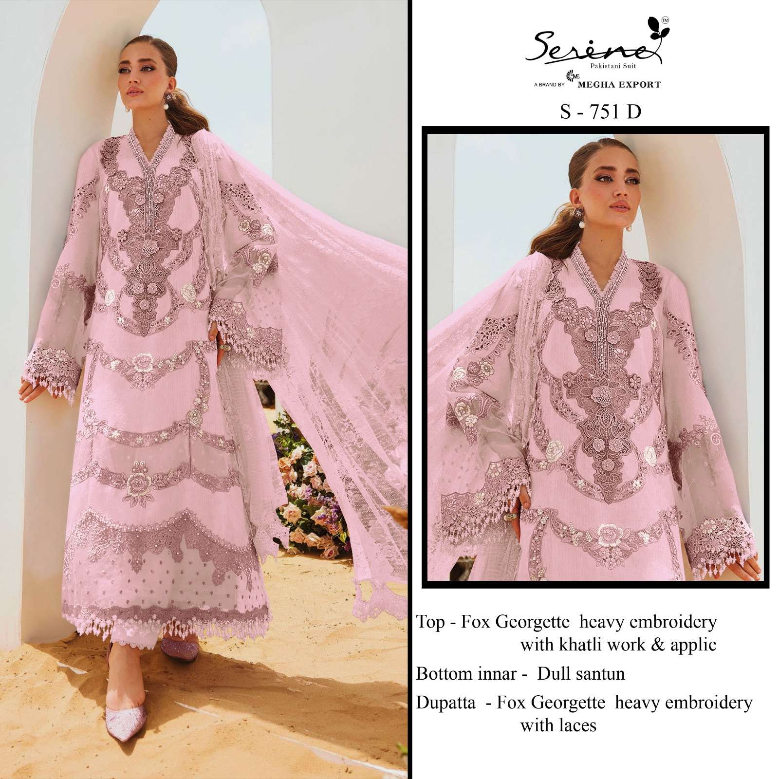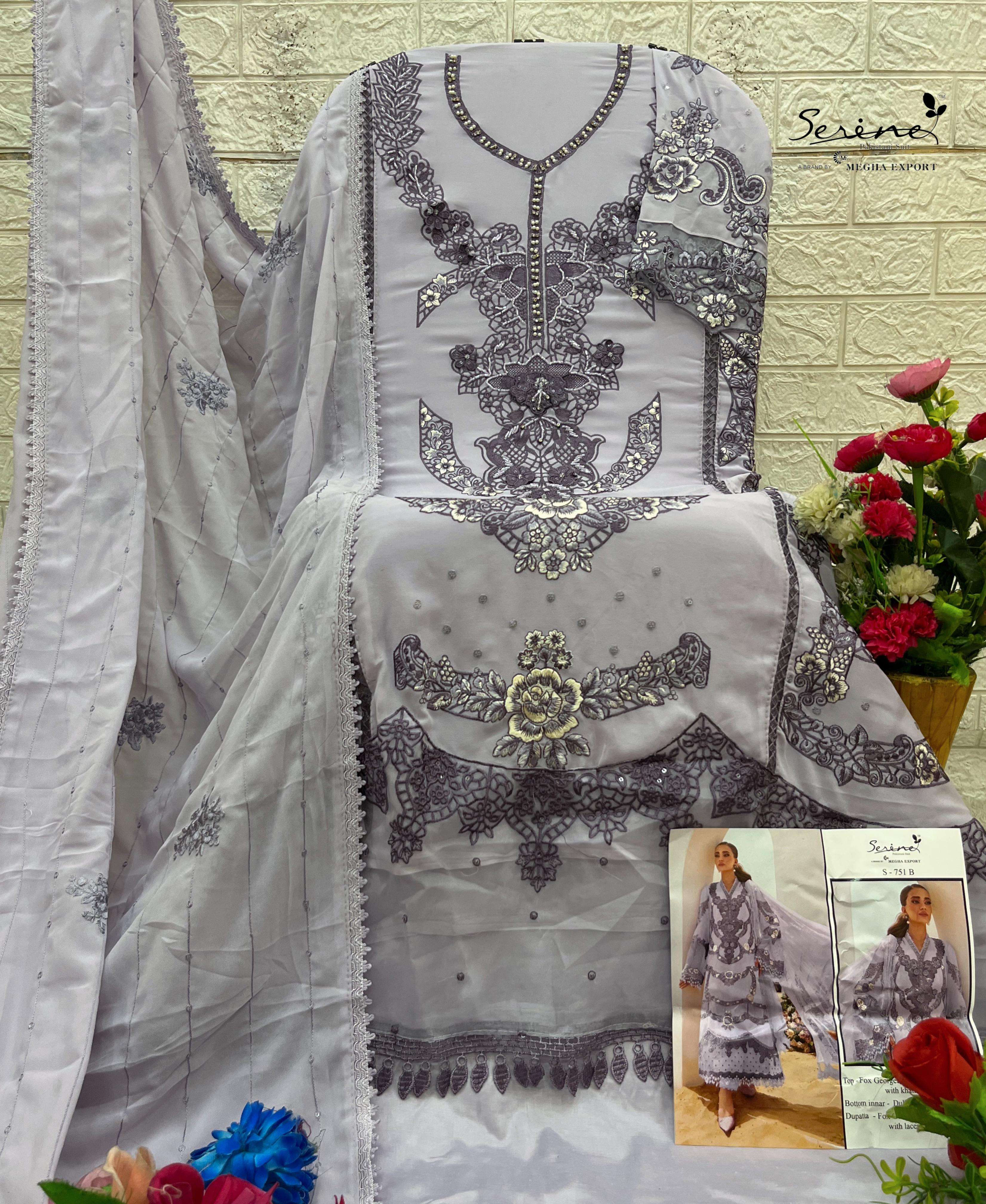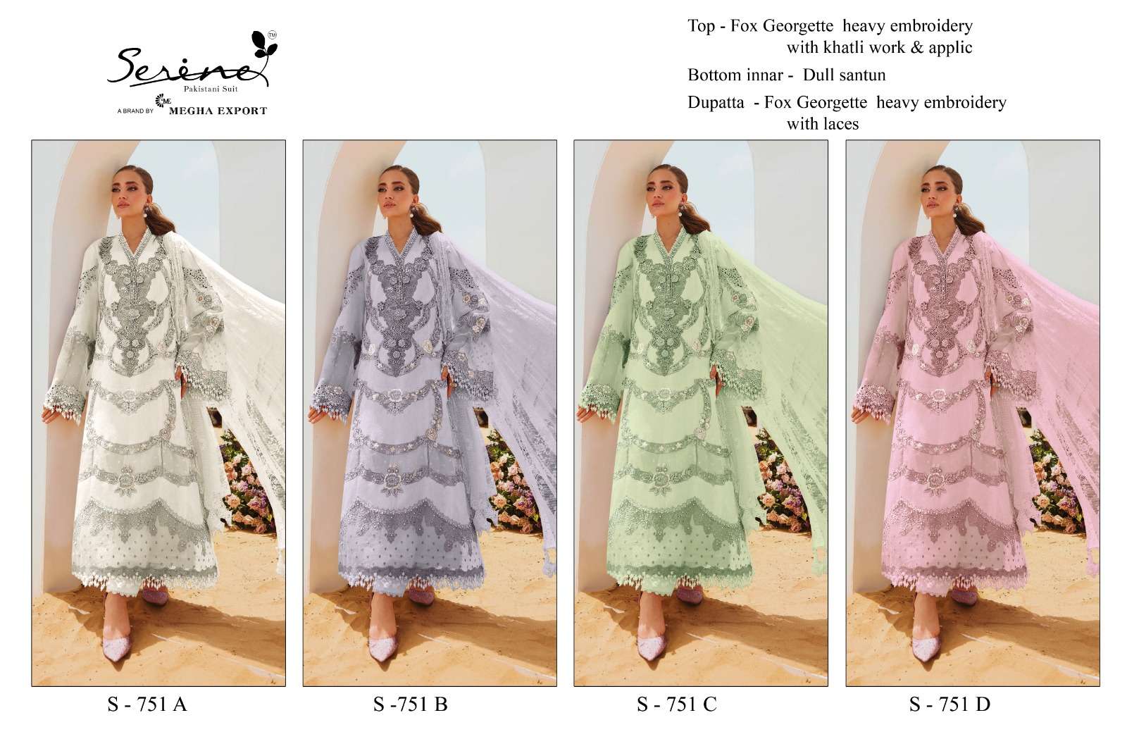 Buy Online SERINA S 751 GEORGETTE HEAVY EMBROIDERY WORK PAKISTANI STYLE SUIT TO EID & WEDDING 4 Pcs of Full Catalogue at Wholesale Price. Looking for SERINA S 751 GEORGETTE HEAVY EMBROIDERY WORK PAKISTANI STYLE SUIT TO EID & WEDDING Full Catalouge at Best Price? Buy Now SERINA S 751 GEORGETTE HEAVY EMBROIDERY WORK PAKISTANI STYLE SUIT TO EID & WEDDING at Wholesale Rate of Rs 6396 with Total 4 Pcs from authroized dealer and supplier of Serine Brand. Cost of Each piece is just only Rs 1599 which is very low and affordable price to resale the product in your retail store Ethnic Export is Surat based Wholesale Supplier & Dealer of Serine Brand. Click on Brand name to Know more about Serine Brand's products.Call or Whatsapp on +91-9825759366 for booking or enquiry