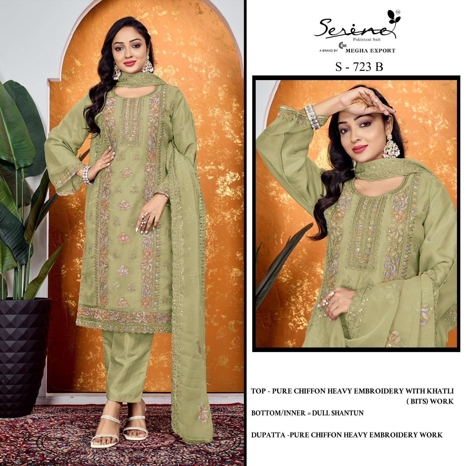 D NO:- S-723 Dupatta:- PURE CHIFFON EMBROIDERY Work BOTTOM.INNER -dull santun *4 PCS IN SE * FULL SET ONLY |