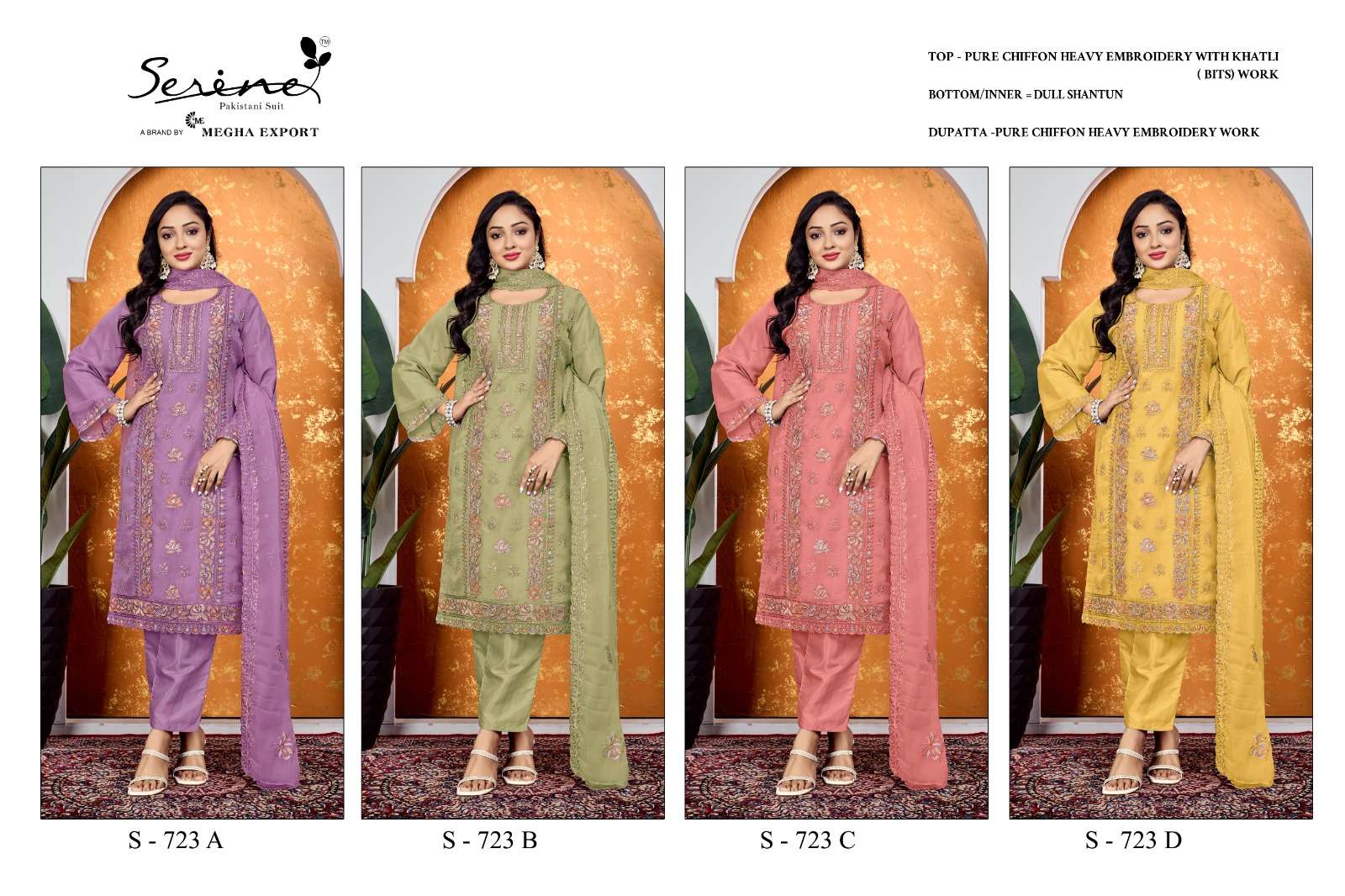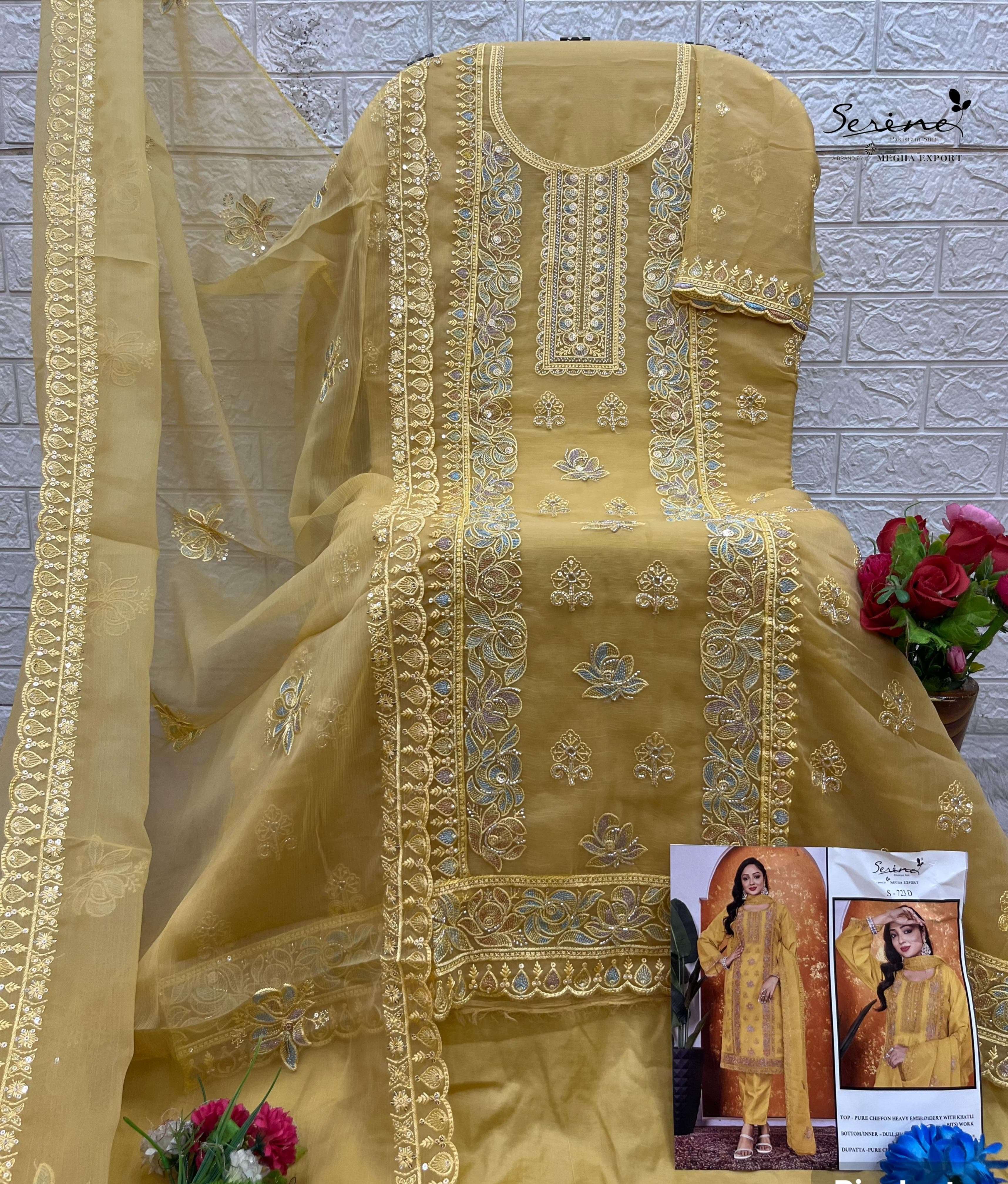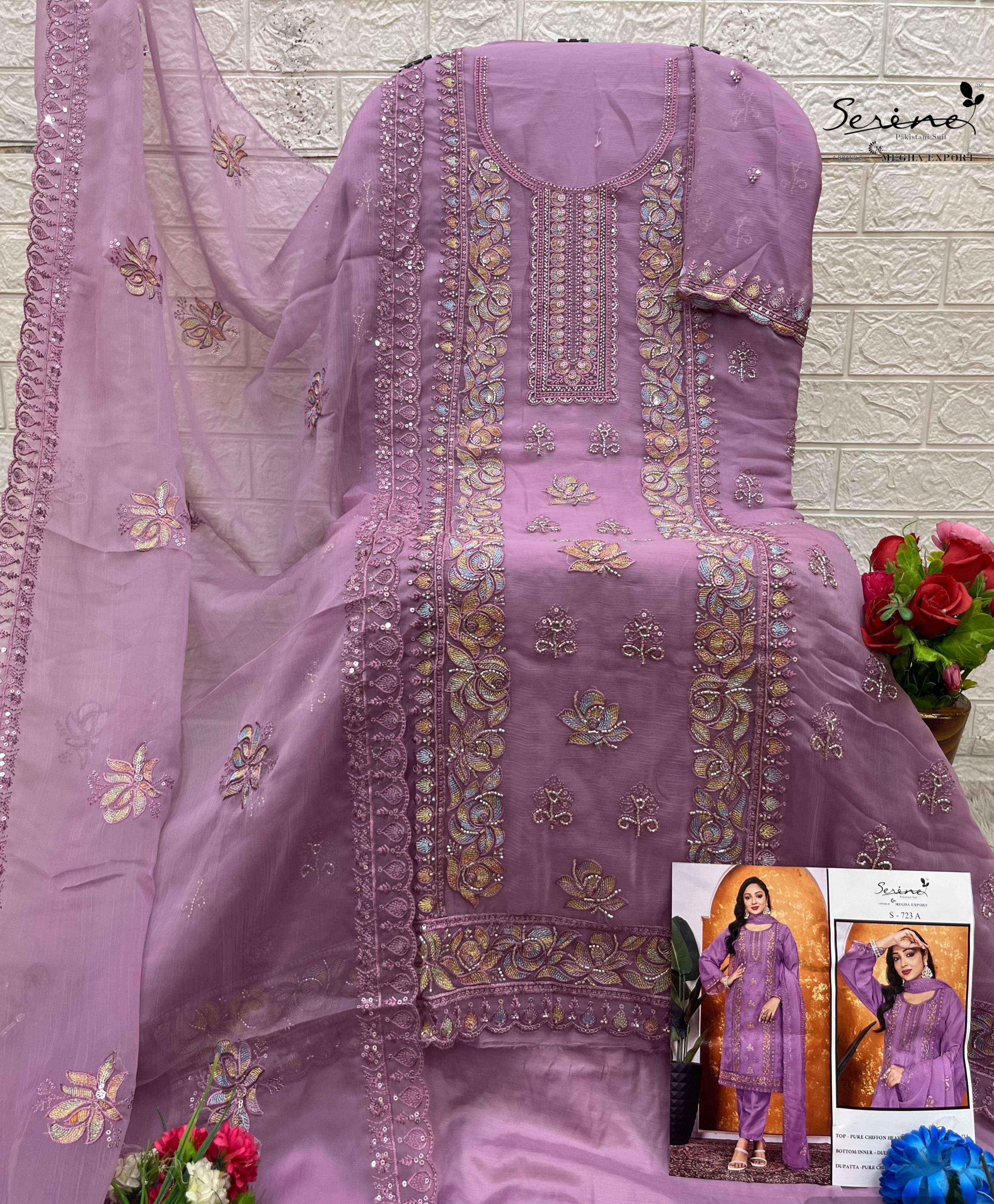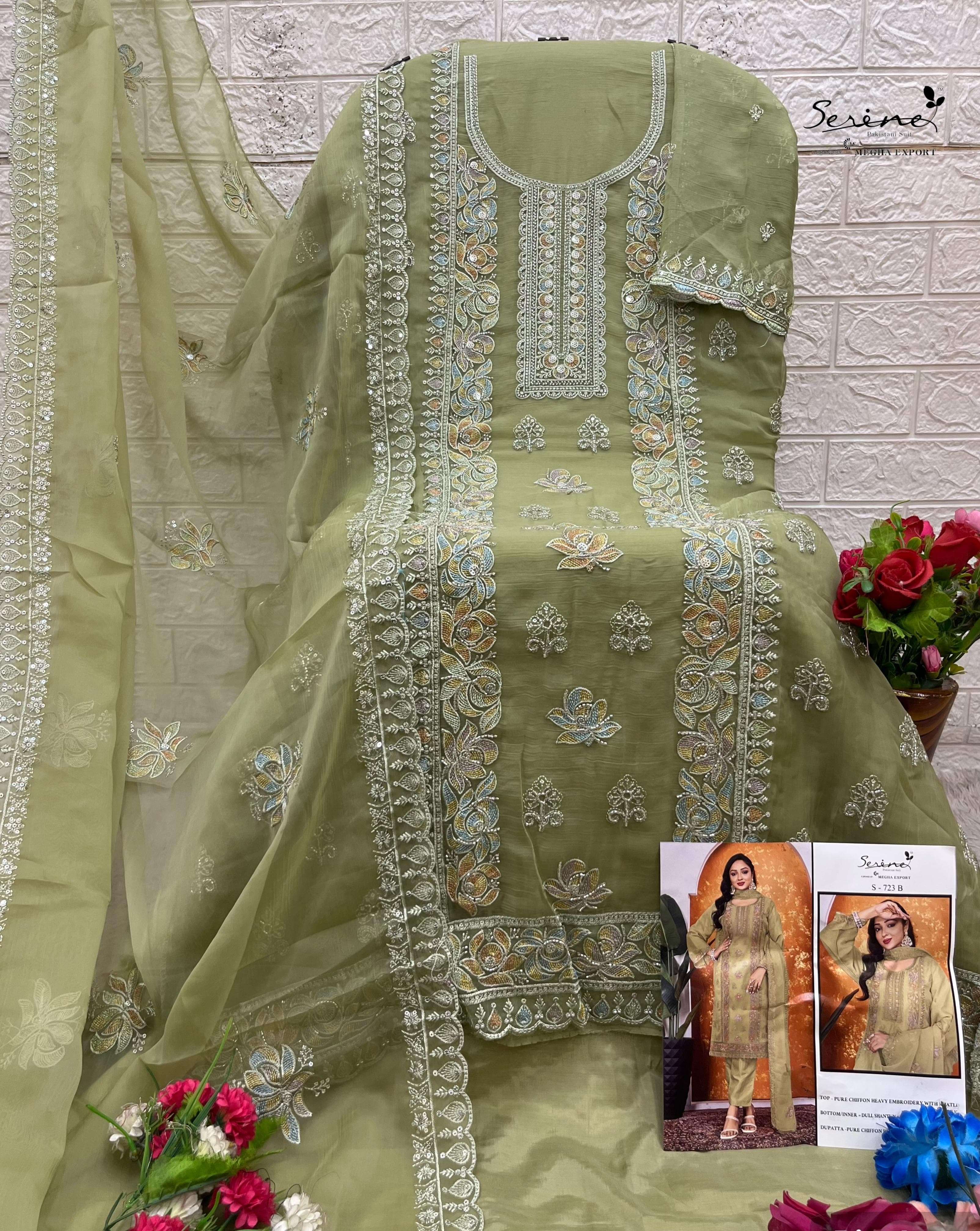 Buy Online SERINE 723 PURE CHIFFON HEAVY EMBROIDERY BITS WORK SUIT TO FUNCTION RESELLER BUY 4 Pcs of Full Catalogue at Wholesale Price. Looking for SERINE 723 PURE CHIFFON HEAVY EMBROIDERY BITS WORK SUIT TO FUNCTION RESELLER BUY Full Catalouge at Best Price? Buy Now SERINE 723 PURE CHIFFON HEAVY EMBROIDERY BITS WORK SUIT TO FUNCTION RESELLER BUY at Wholesale Rate of Rs 6596 with Total 4 Pcs from authroized dealer and supplier of Serine Brand. Cost of Each piece is just only Rs 1649 which is very low and affordable price to resale the product in your retail store Ethnic Export is Surat based Wholesale Supplier & Dealer of Serine Brand. Click on Brand name to Know more about Serine Brand's products.Call or Whatsapp on +91-9825759366 for booking or enquiry