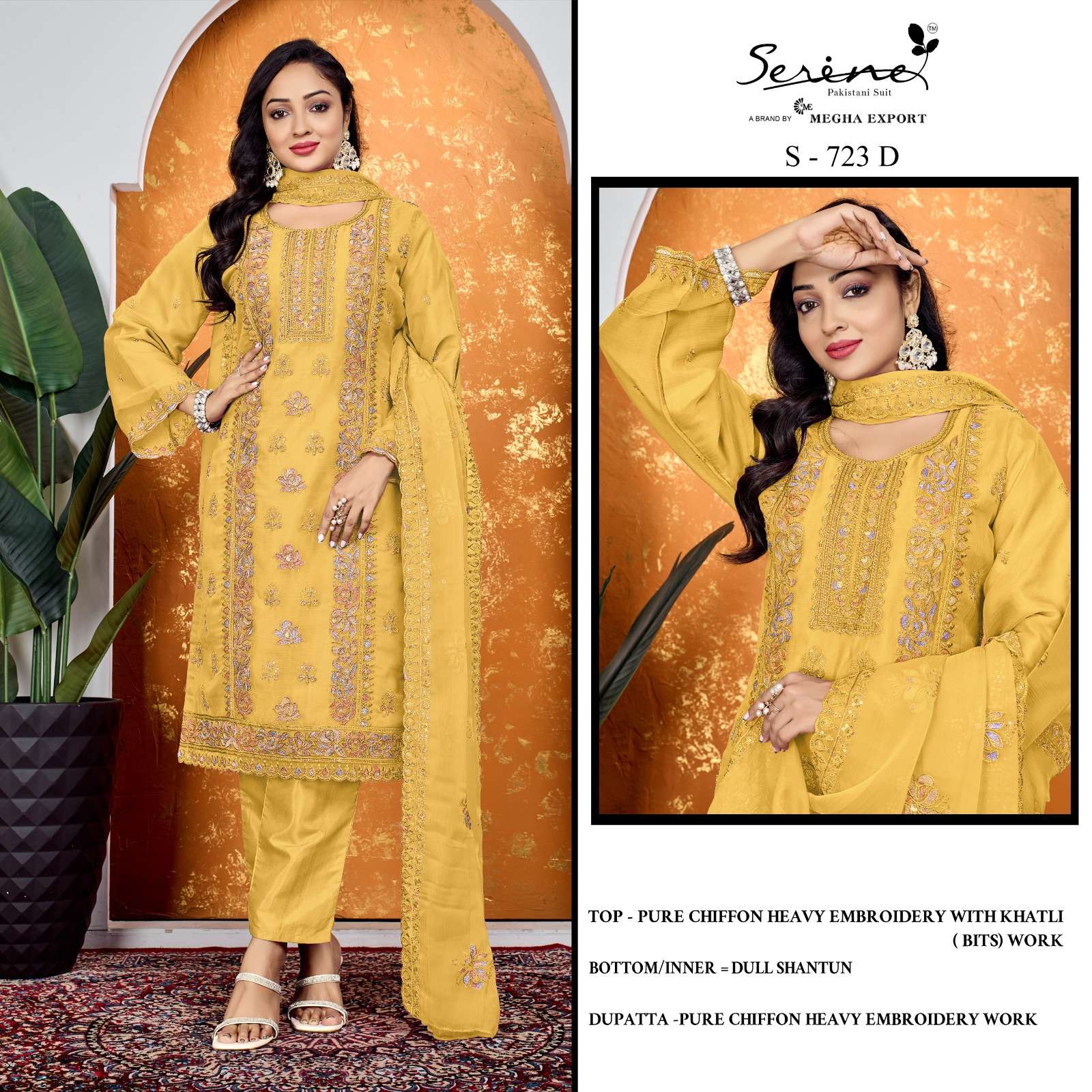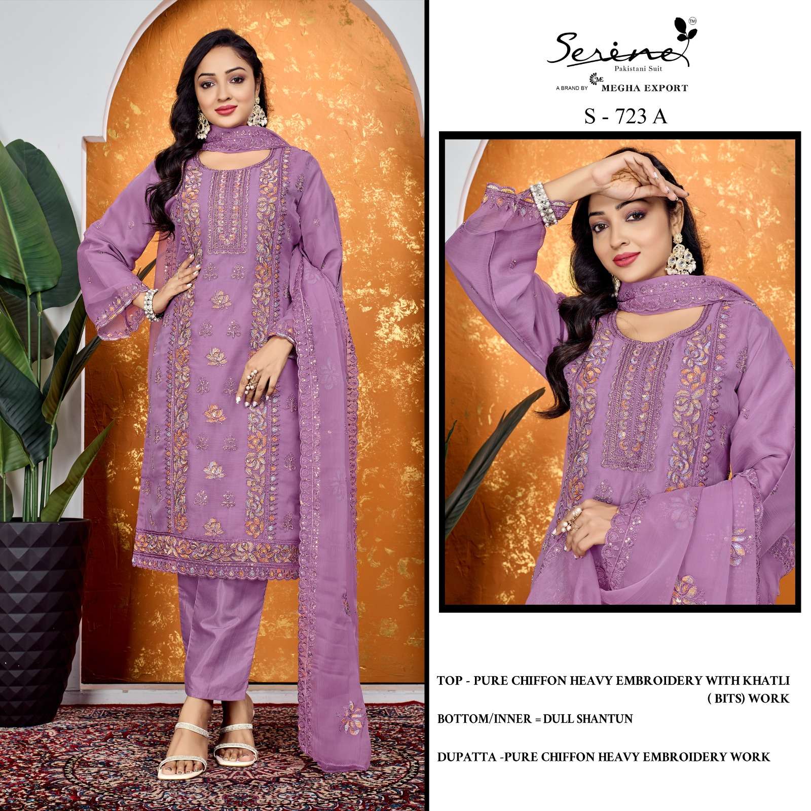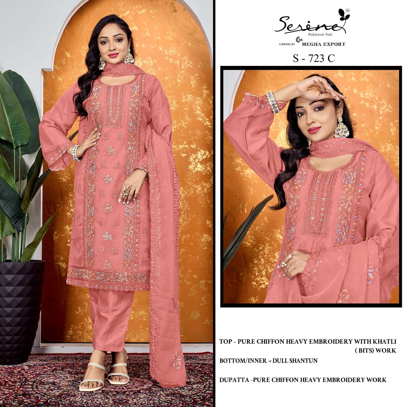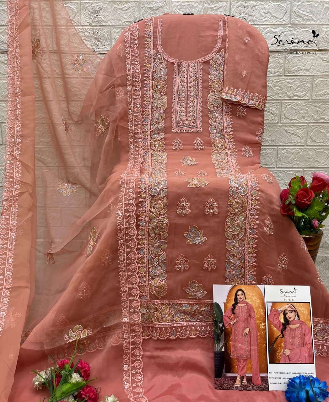 Buy Online SERINE 723 PURE CHIFFON HEAVY EMBROIDERY BITS WORK SUIT TO FUNCTION RESELLER BUY 4 Pcs of Full Catalogue at Wholesale Price. Looking for SERINE 723 PURE CHIFFON HEAVY EMBROIDERY BITS WORK SUIT TO FUNCTION RESELLER BUY Full Catalouge at Best Price? Buy Now SERINE 723 PURE CHIFFON HEAVY EMBROIDERY BITS WORK SUIT TO FUNCTION RESELLER BUY at Wholesale Rate of Rs 6596 with Total 4 Pcs from authroized dealer and supplier of Serine Brand. Cost of Each piece is just only Rs 1649 which is very low and affordable price to resale the product in your retail store Ethnic Export is Surat based Wholesale Supplier & Dealer of Serine Brand. Click on Brand name to Know more about Serine Brand's products.Call or Whatsapp on +91-9825759366 for booking or enquiry