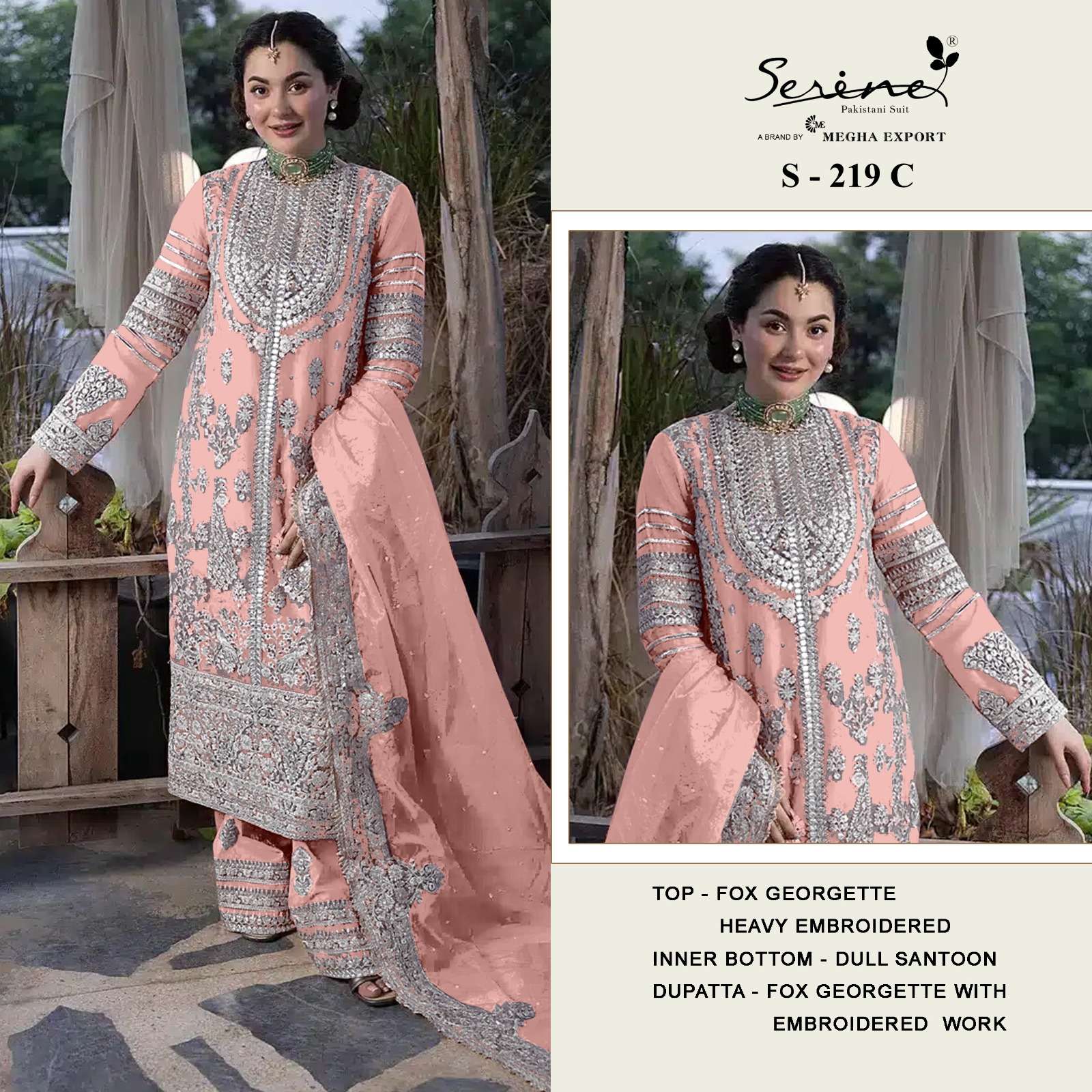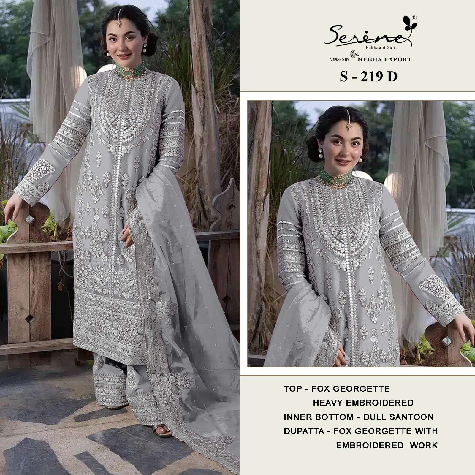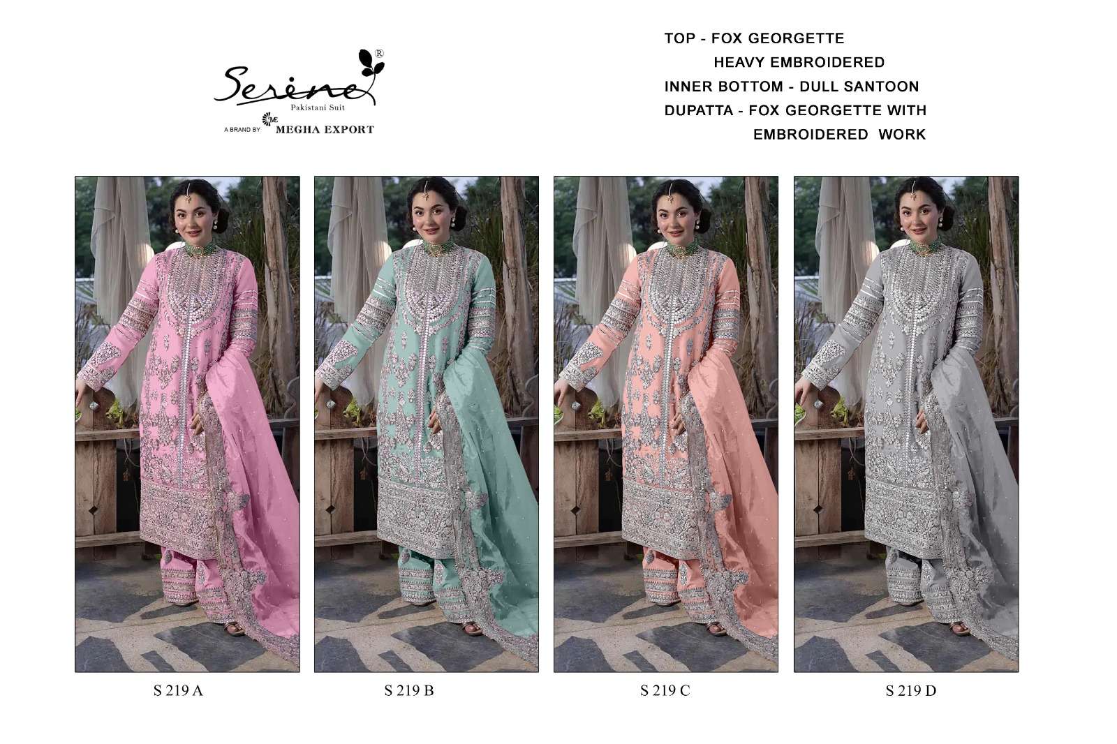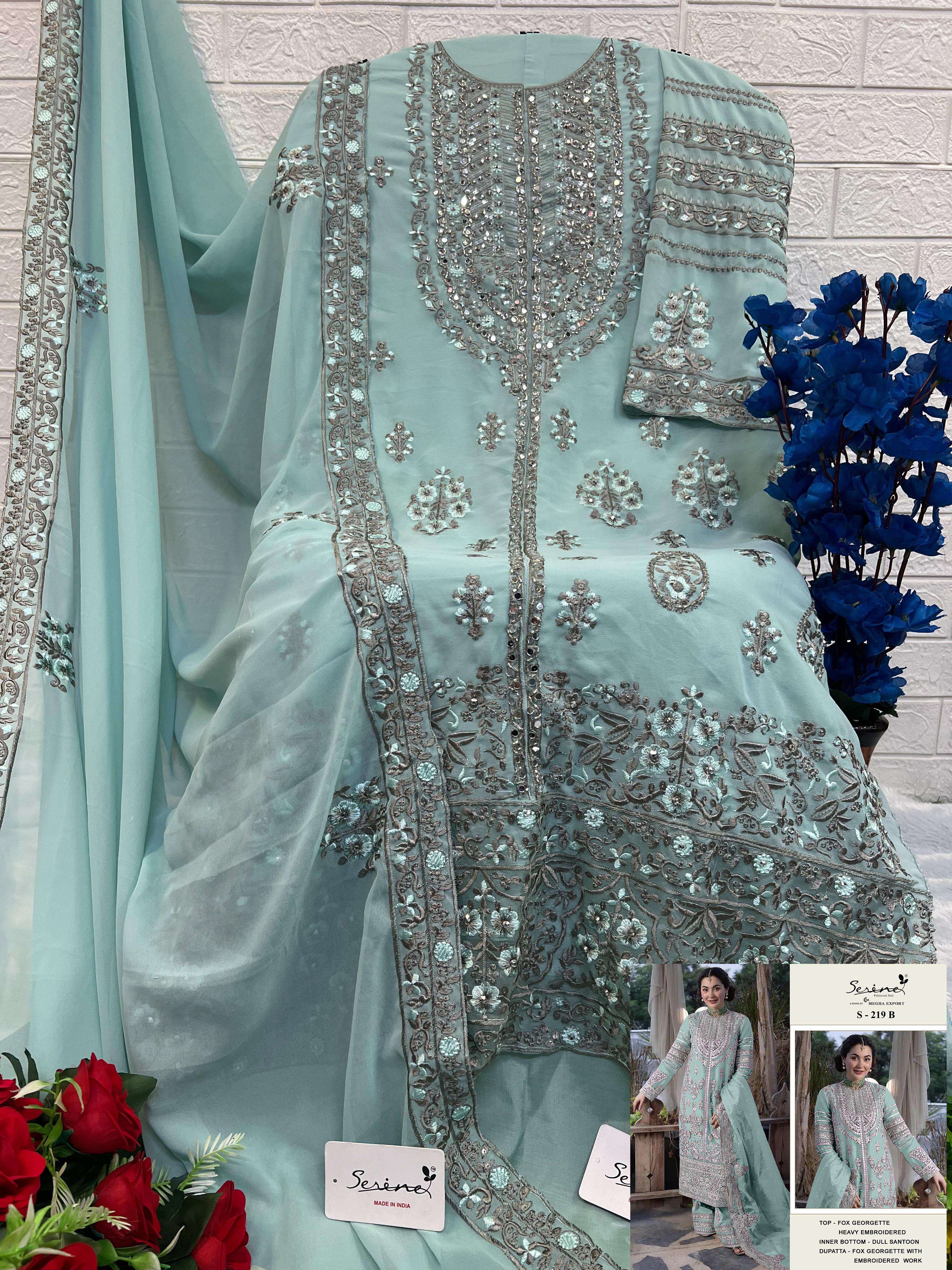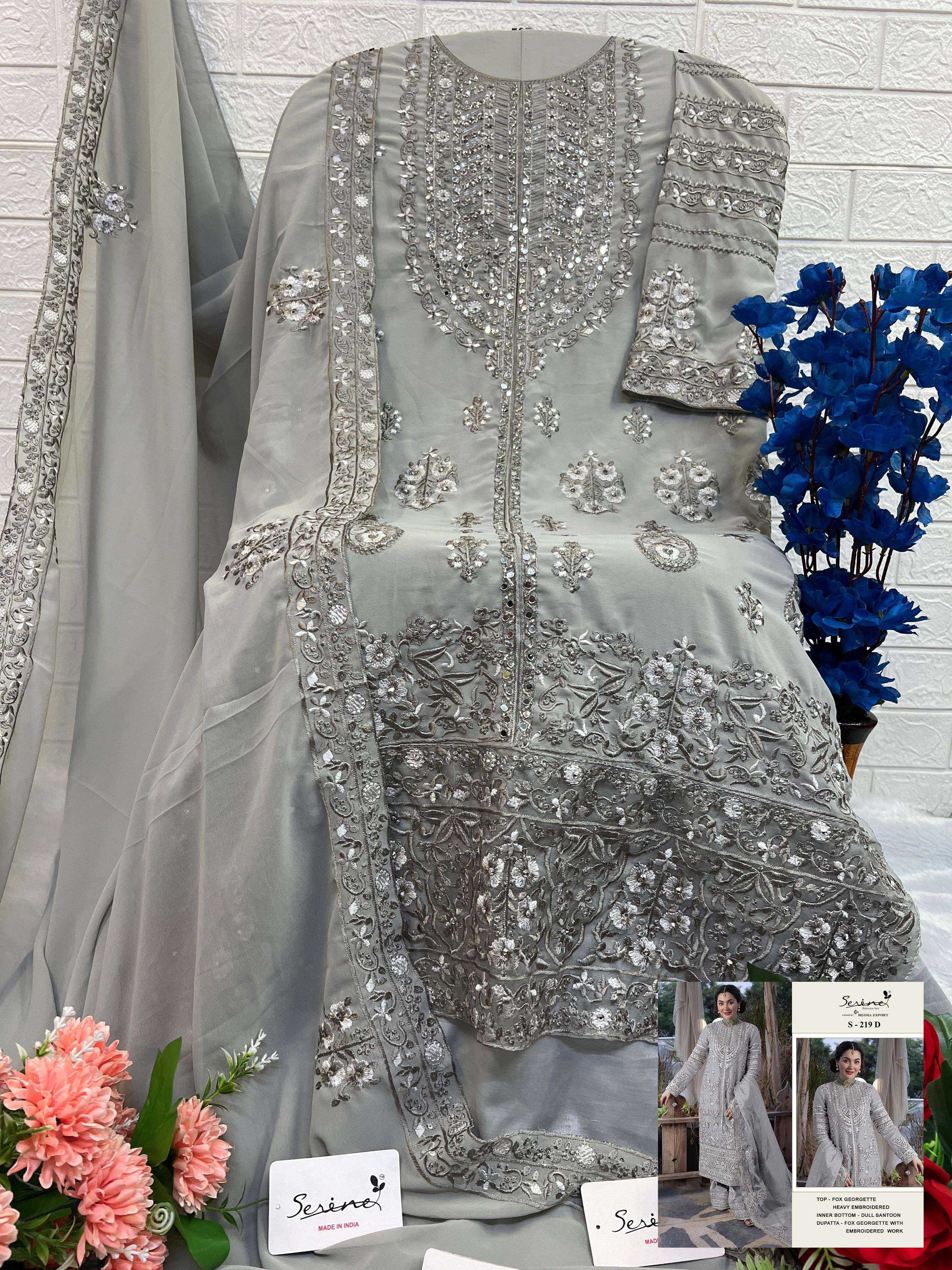 Buy Online SERINE S 219 HANIA AAMIR PAKISTANI SUIT GEORGETTE HAND WORK SALWAR SUIT BUY INDIA 4 Pcs of Full Catalogue at Wholesale Price. Looking for SERINE S 219 HANIA AAMIR PAKISTANI SUIT GEORGETTE HAND WORK SALWAR SUIT BUY INDIA Full Catalouge at Best Price? Buy Now SERINE S 219 HANIA AAMIR PAKISTANI SUIT GEORGETTE HAND WORK SALWAR SUIT BUY INDIA at Wholesale Rate of Rs 5196 with Total 4 Pcs from authroized dealer and supplier of Serine Brand. Cost of Each piece is just only Rs 1299 which is very low and affordable price to resale the product in your retail store Ethnic Export is Surat based Wholesale Supplier & Dealer of Serine Brand. Click on Brand name to Know more about Serine Brand's products.Call or Whatsapp on +91-9825759366 for booking or enquiry