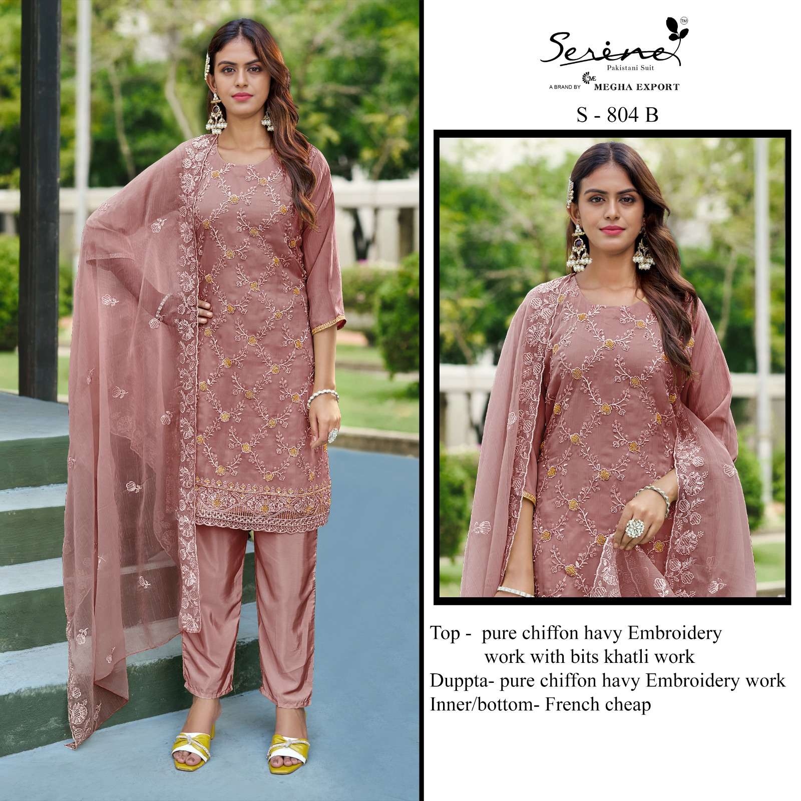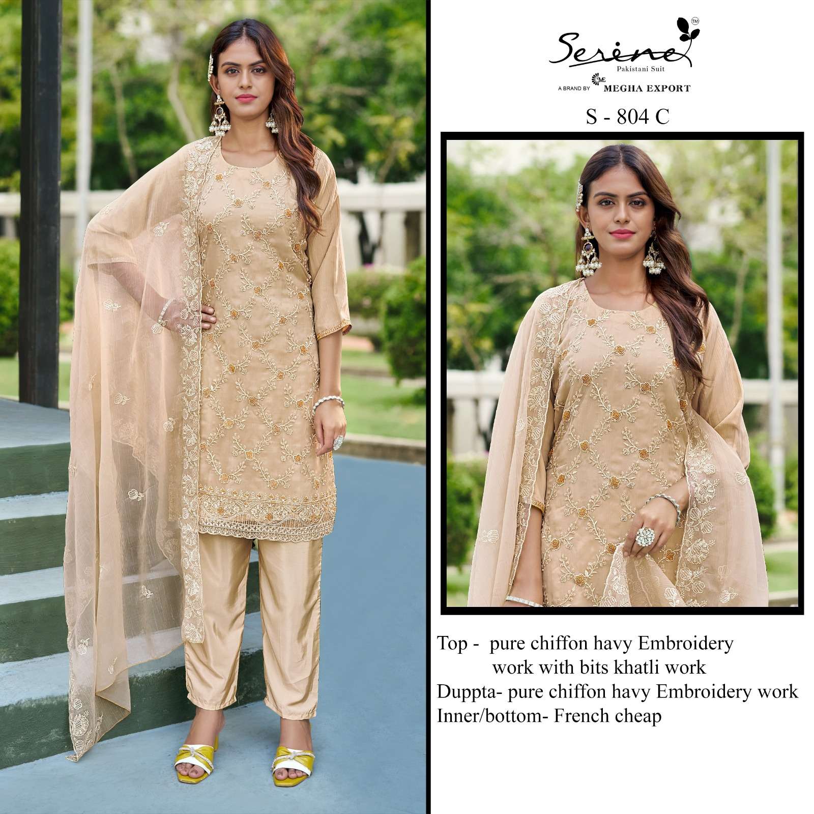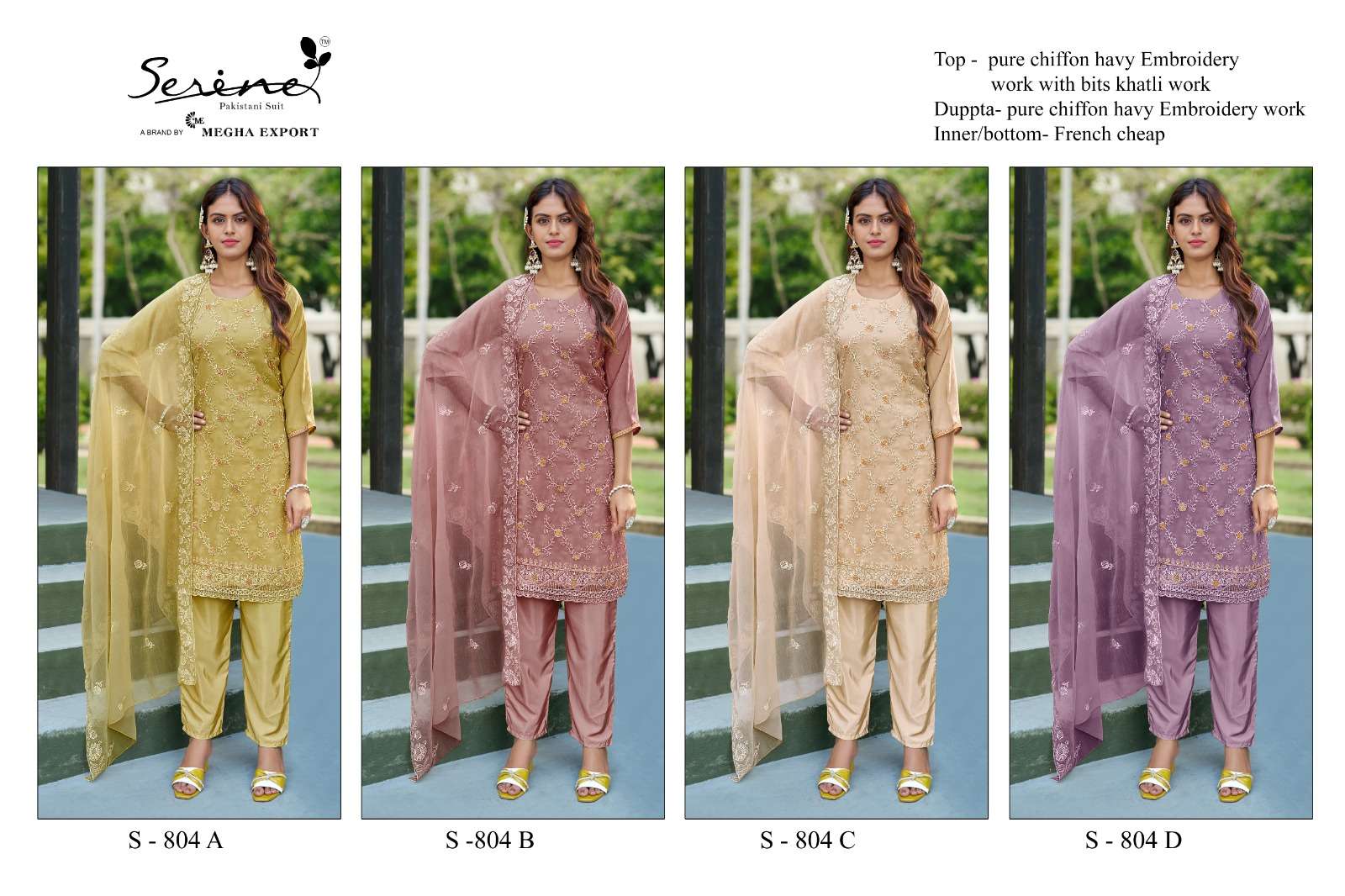 Buy Online SERINE S 804 EMBROIDERY WORK WEDDING STYPE SUIT FOR FEMALE INDIAN RESELLER 4 Pcs of Full Catalogue at Wholesale Price. Looking for SERINE S 804 EMBROIDERY WORK WEDDING STYPE SUIT FOR FEMALE INDIAN RESELLER Full Catalouge at Best Price? Buy Now SERINE S 804 EMBROIDERY WORK WEDDING STYPE SUIT FOR FEMALE INDIAN RESELLER at Wholesale Rate of Rs 6596 with Total 4 Pcs from authroized dealer and supplier of Serine Brand. Cost of Each piece is just only Rs 1649 which is very low and affordable price to resale the product in your retail store Ethnic Export is Surat based Wholesale Supplier & Dealer of Serine Brand. Click on Brand name to Know more about Serine Brand's products.Call or Whatsapp on +91-9825759366 for booking or enquiry
