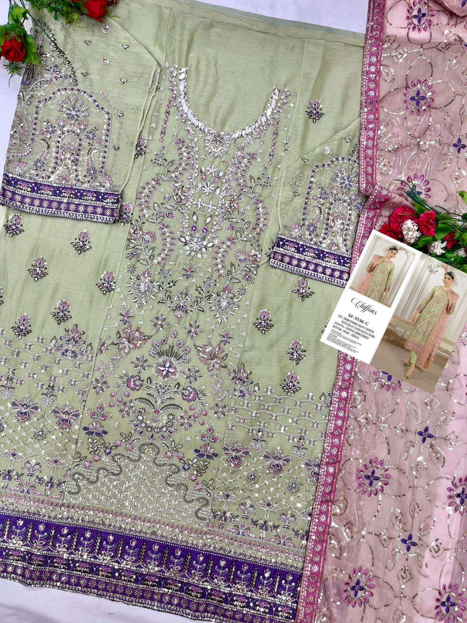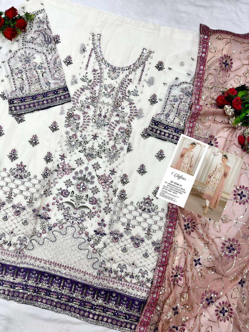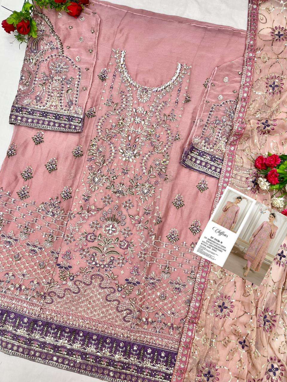 S F- 5536 colour Top - siffon with Embroidery khatli work Bottom - French silk Dupatta- Siffion with embroidery Rate - 1599/- Special pouch packing