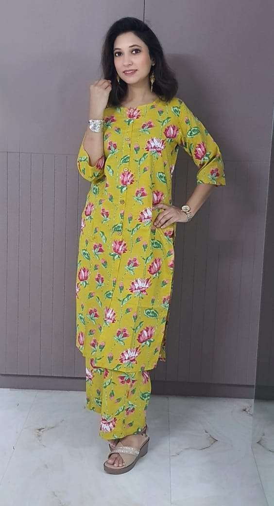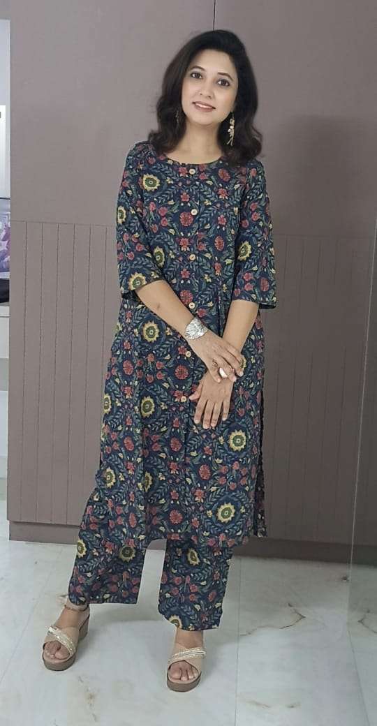 Fabric: Soft Camric Cotton Size: M to 3Xl Top : Top with front slit n side slit with wooden show buttons Pant: Both side elasticated plazo pant with Miyani SINGLE ALSO AVA |