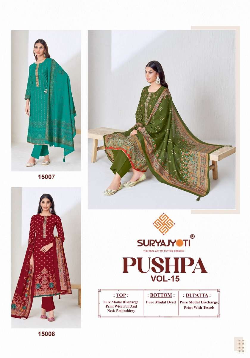 Title | SURYAJYOTI PUSHPA VOL 15 GOOD QUALITY DISCHARGE FOIL PRINT SALWAR KAMEEZ COLLECTION EXPORT | ||