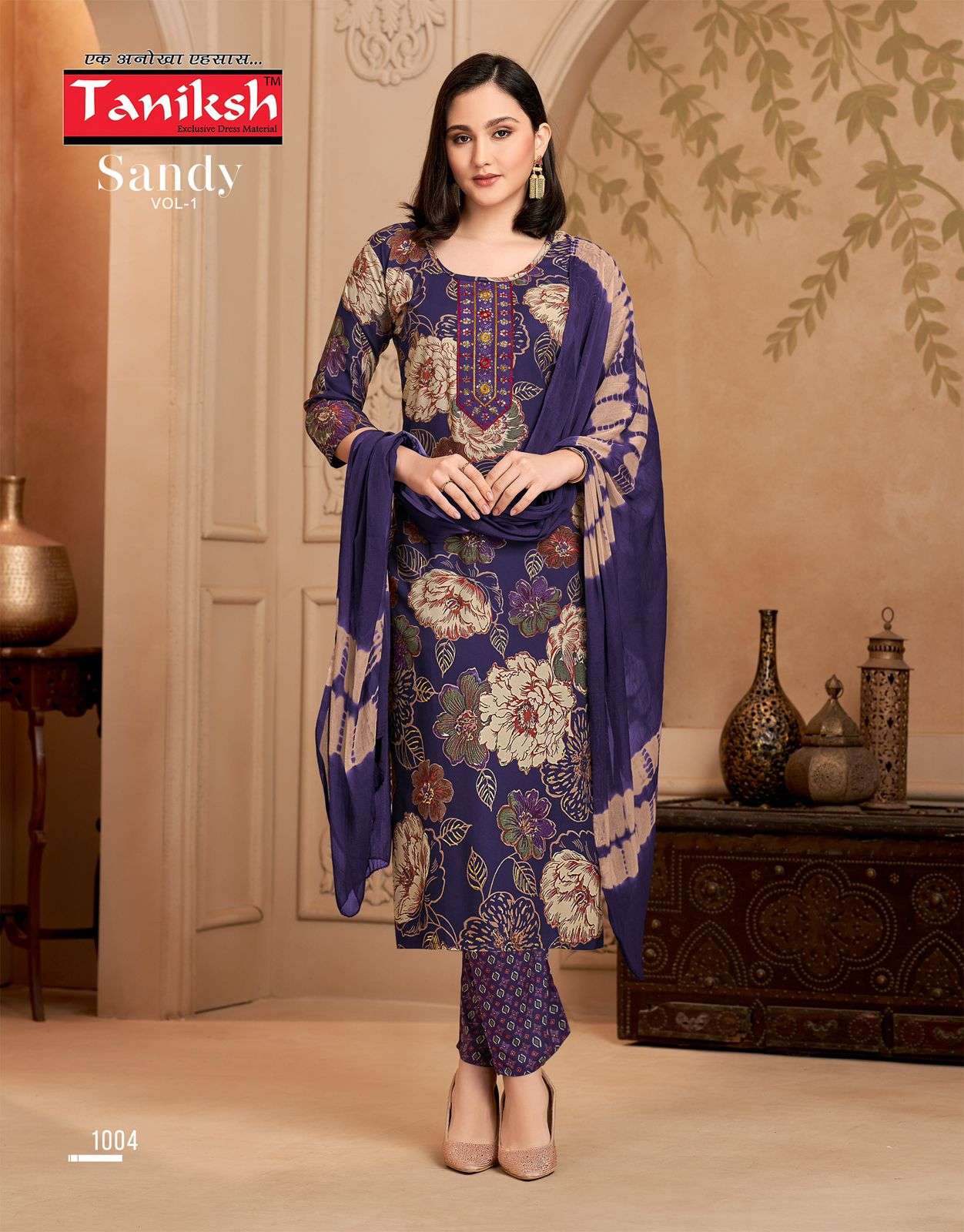 Buy Online TANIKSH SANDY VOL 1 RAYON FOIL PRINT READY TO WEAR SALWAR KAMEEZ DAILY USE DEALER 6 Pcs of Full Catalogue at Wholesale Price. Looking for TANIKSH SANDY VOL 1 RAYON FOIL PRINT READY TO WEAR SALWAR KAMEEZ DAILY USE DEALER Full Catalouge at Best Price? Buy Now TANIKSH SANDY VOL 1 RAYON FOIL PRINT READY TO WEAR SALWAR KAMEEZ DAILY USE DEALER at Wholesale Rate of Rs 2994 with Total 6 Pcs from authroized dealer and supplier of Taniksh Brand. Cost of Each piece is just only Rs 499 which is very low and affordable price to resale the product in your retail store Ethnic Export is Surat based Wholesale Supplier & Dealer of Taniksh Brand. Click on Brand name to Know more about Taniksh Brand's products.Call or Whatsapp on +91-9825759366 for booking or enquiry