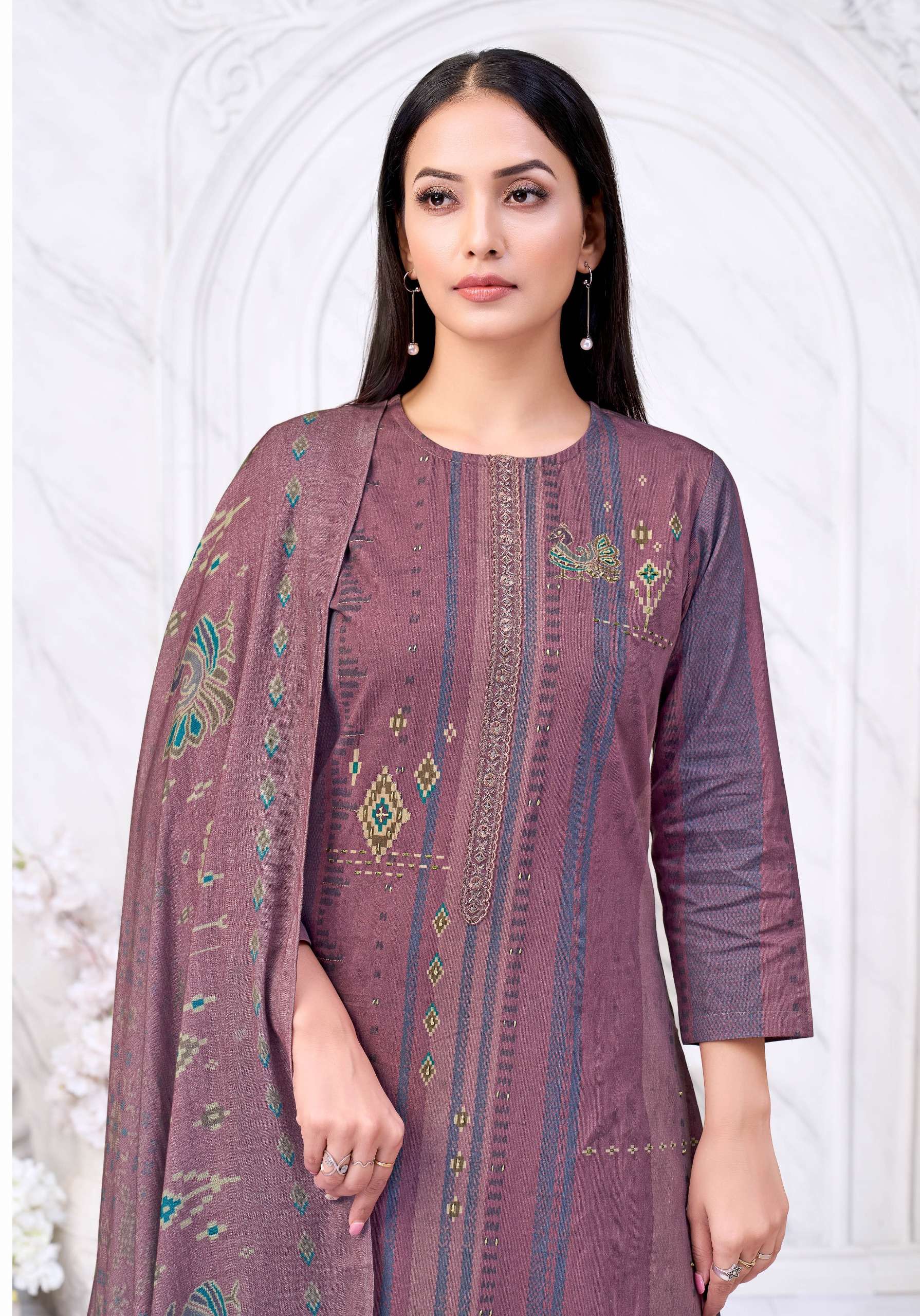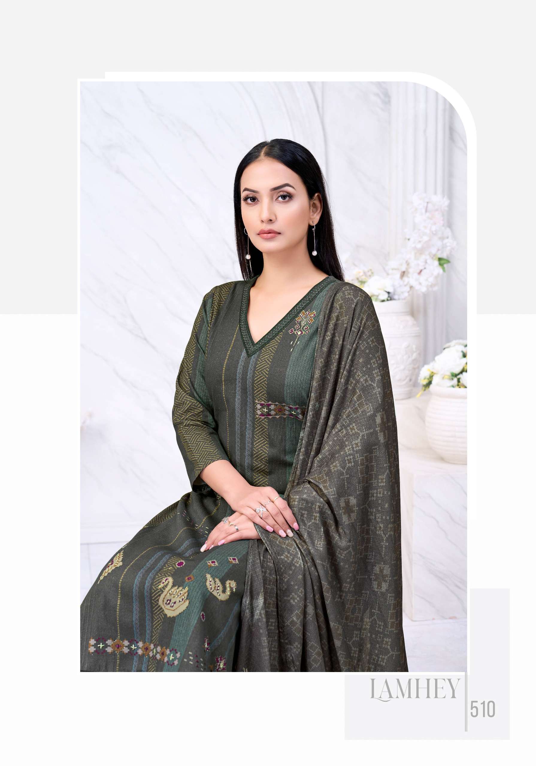LAMHEY TOP - PURE CORDUROY, FEATURING RICH DIGITAL PRINTS, COMPLEMENTED BY INTRICATE HAND WORK, ELEGANT EMBROIDERED DAMAN, AND EMBROIDERED NECK PATTI. BOTTOM - PURE HEAVY PASHMINA SOLID, PAIRED WITH A STYLISH EMBROIDERED PALAZZO FOR AN ELEVATED LOOK. DUPATTA - PURE SHAWL WITH ELEGANT DIGITAL PRINT FULL SET ONLY |
