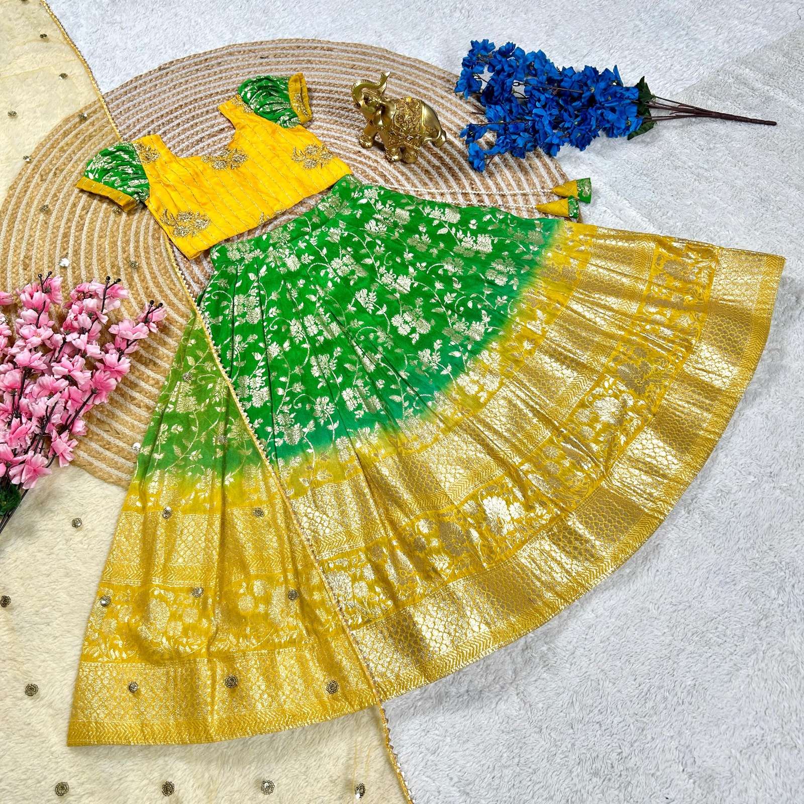 YELLOW GREEN SHADES ORGANZA FABRIC BEAUTIFUL LOOK LITTLE PRINCESS LEHENGA CHOLI BEST COLLECTION