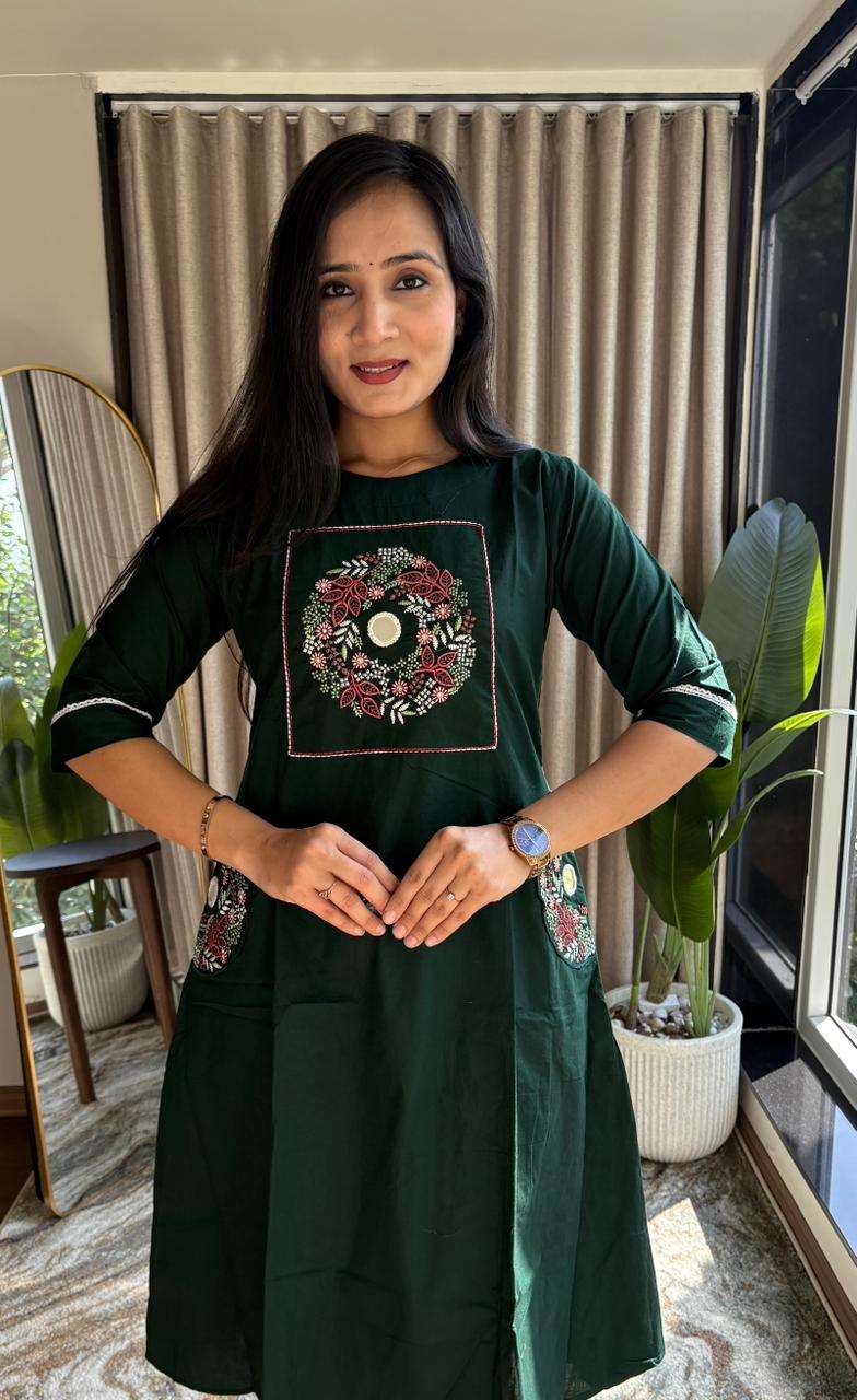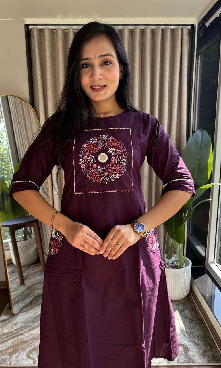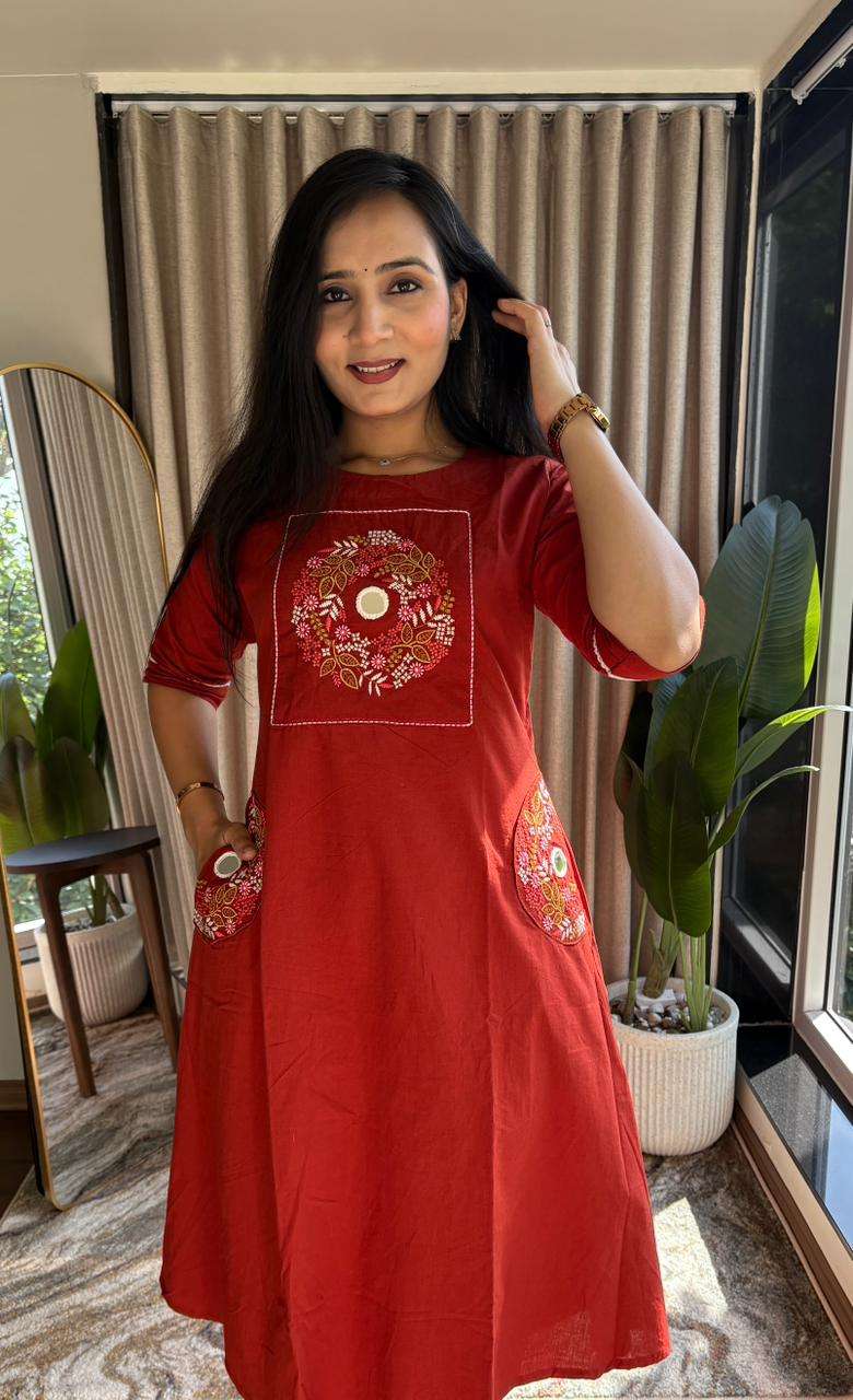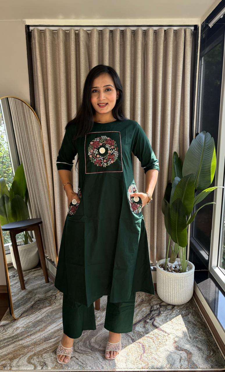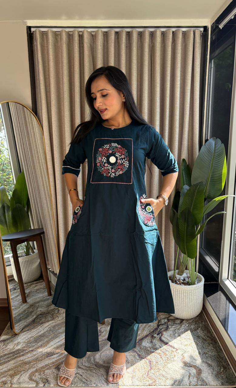 Aline kurti with double side pocket work BEAUTIFUL EMRODIARY PATCH ON NACK AND DOUBLE POCKET & plazo with miyani & fully interlock M To 4XL Size Sets SINGLE ALSO AVA |
