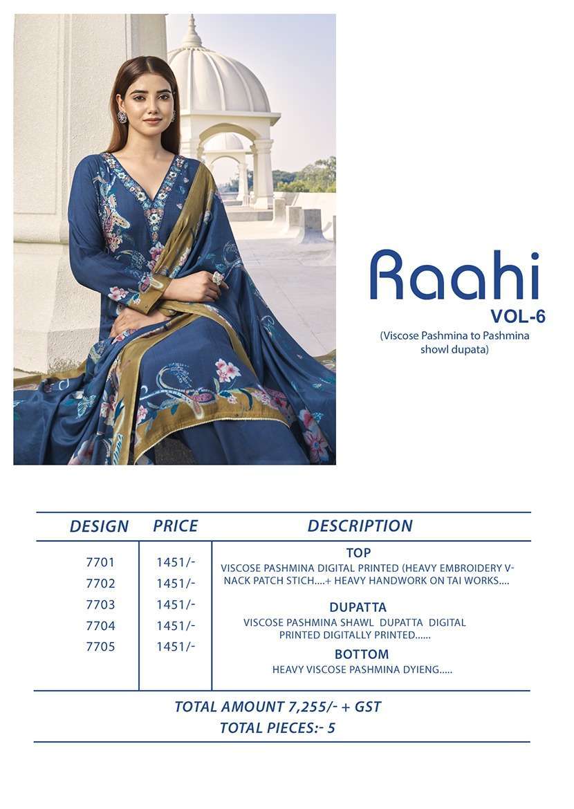 Title | RUPALI FASHION RAAHI VOL 6 COMFORT FUNCTION FANCY PASHMINA PRINT SUIT PRICE RESELLER |
