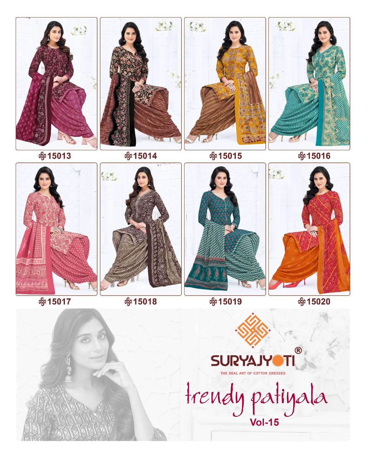 Buy Online SURYAJYOTI TRENDY PATIYALA VOL 15 SUMMER REGULAR WEAR COTTON PATIYALA SUIT DEALER 20 Pcs of Full Catalogue at Wholesale Price. Looking for SURYAJYOTI TRENDY PATIYALA VOL 15 SUMMER REGULAR WEAR COTTON PATIYALA SUIT DEALER Full Catalouge at Best Price? Buy Now SURYAJYOTI TRENDY PATIYALA VOL 15 SUMMER REGULAR WEAR COTTON PATIYALA SUIT DEALER at Wholesale Rate of Rs 9100 with Total 20 Pcs from authroized dealer and supplier of SURYAJYOTI Brand. Cost of Each piece is just only Rs 455 which is very low and affordable price to resale the product in your retail store Ethnic Export is Surat based Wholesale Supplier & Dealer of SURYAJYOTI Brand. Click on Brand name to Know more about SURYAJYOTI Brand's products.Call or Whatsapp on +91-9825759366 for booking or enquiry
